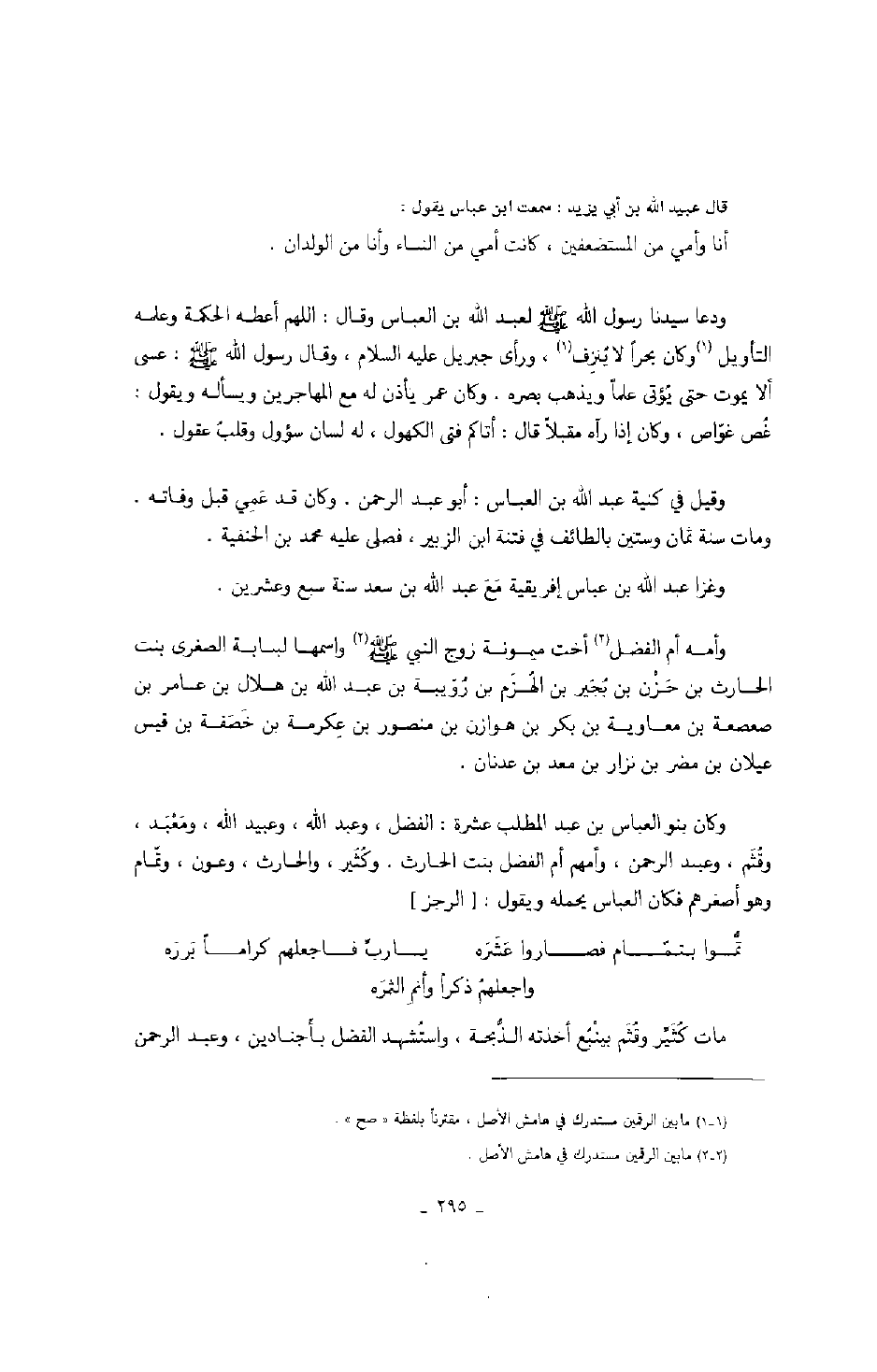 وكان بنو العباس بن عبد المطلب عشرة: الفضل، وعبد الله، وعبيد الله، ومعبد، وقثم، وعبد الرحمن، وأمهم أم الفضل بنت الحارث. وكثير، والحارث، وعون، وتمام وهو أصغرهم فكان العباس يحمله يحمله ويقول: الرجز