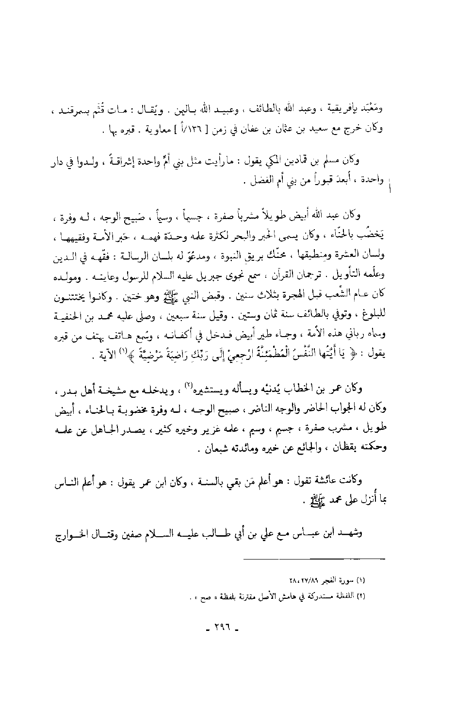 وكان عبد الله أبيض طويلاً مشرباً صفرة، جسيماً، وسيماً، صبيح الوجه، له وفرة، يخضب بالحناء، وكان يسمى الحبر والبحر لكثرة علمه وحدة فهمه، حبر الأمة وفقيهها، ولسان العشرة ومنطيقها، محنك بريق النبوة، ومدعو له بلسان الرسالة: فقهه في الدين وعلمه التأويل. ترجمان القرآن، سمع نجوى جبريل عليه السلام للرسول وعاينه. ومولده كان عام الشعب قبل الهجرة بثلاث سنين. وقبض النبي صَلَّى اللهُ عَلَيْهِ وَسَلَّمَ وهو ختين. وكانوا يختتنون للبلوغ، وتوفي بالطائف سنة ثمان وستين. وقيل سنة سبعين، وصلى عليه محمد بن الحنفية وسماه رباني هذه الأمة، وجاء طير أبيض فدخل في أكفانه، وسمع هاتف يهتف من قبره يقول: " يا أيتها النفس المطمئنة ارجعي إلى ربك راضيةً مرضيةً " الآية.