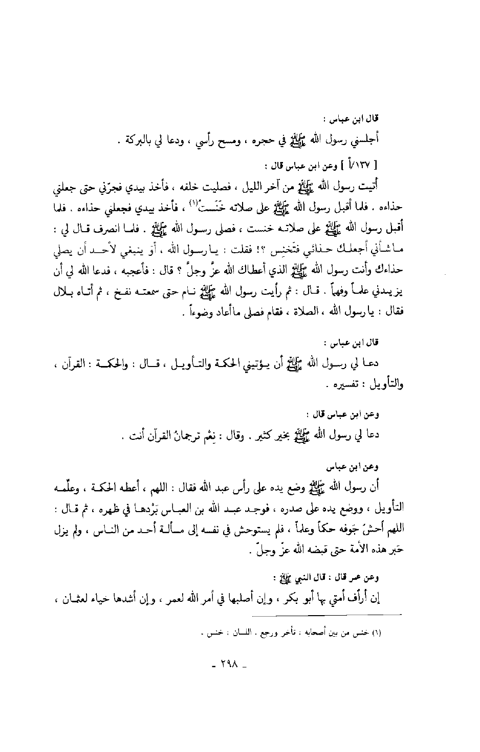 وعن ابن عباس قال: أتيت رسول الله صَلَّى اللهُ عَلَيْهِ وَسَلَّمَ من آخر الليل، فصليت خلفه، فأخذ بيدي فجرني حتى جعلني حذاءه. فلما أقبل رسول الله صَلَّى اللهُ عَلَيْهِ وَسَلَّمَ على صلاته خنست، فأخذ بيدي فجعلني حذاءه. فلما أقبل رسول الله صَلَّى اللهُ عَلَيْهِ وَسَلَّمَ على صلاته خنست، فصلى رسول الله صَلَّى اللهُ عَلَيْهِ وَسَلَّمَ. فلما انصرف قال لي: ما شأني أجعلك حذائي فتخنس؟! فقلت: يا رسول الله، أو ينبغي لأحد أن يصلي حذاءك وأنت رسول الله صَلَّى اللهُ عَلَيْهِ وَسَلَّمَ الذي أعطاك الله عز وجل؟ قال: فأعجبه، فدعا الله لي أن يزيدني علماً وفهماً. قال: ثم رأيت رسول الله صَلَّى اللهُ عَلَيْهِ وَسَلَّمَ نام حتى سمعته نفخ، ثم أتاه بلال فقال: يا رسول الله، الصلاة، فقام فصلى ما أعاد وضوءاً.