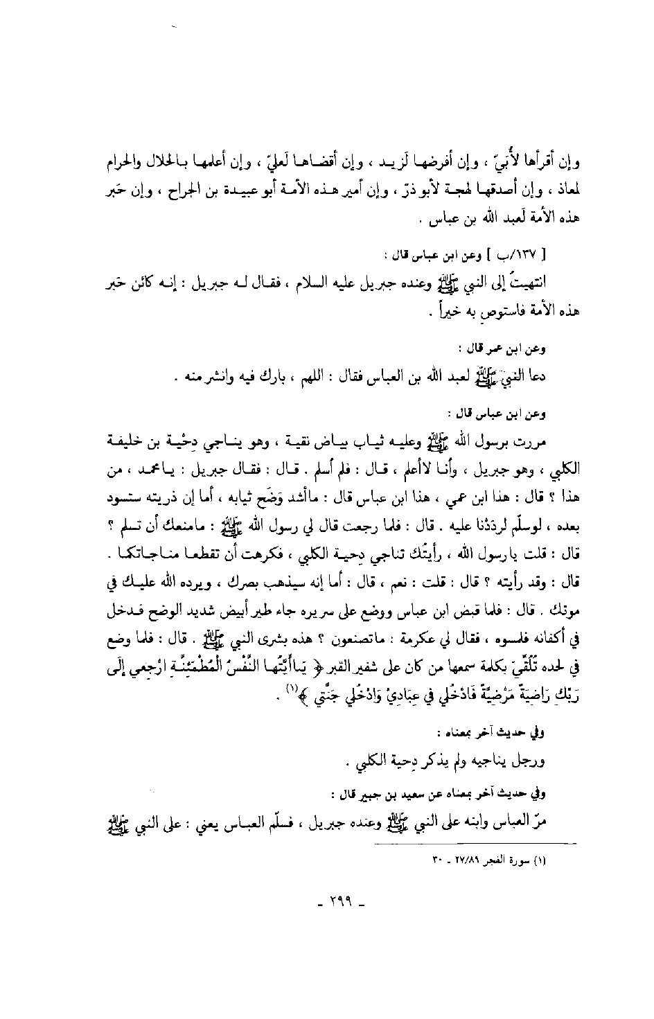 وعن ابن عباس قال: مررت برسول الله وعليه ثياب بياض نقية، وهو يناجي دحية بن خليفة الكلبي، وهو جبريل، وأنا لا أعلم، قال: فلم أسلم. قال جبريل: يا محمد، من هذا؟ قال: هذا ابن عمي، هذا ابن عباس قال: ما أشد وضح ثيابه، أما إن ذريته ستسود بعده، لو سلم لرددنا عليه. قال: فلما رجعت قال: فلما رجعت قال لي رسول الله صَلَّى اللهُ عَلَيْهِ وَسَلَّمَ: ما منعك أن تسلم؟ قال: قلت يا رسول الله، رأيتك تناجي دحية الكلبي، فكرهت أن تقطعا منجاتكما. قال: وقد رأيته؟ قال: قلت: نعم، قال: أما إنه سيذهب بصرك، ويرده الله عليك في موتك. قال: فلما قبض ابن عباس ووضع على سريره جاء طير أبيض شديد الوضح فدخل في أكفانه فلمسوه، فقال لي عكرمة: ما تصنعون؟ هذه بشرى النبي صَلَّى اللهُ عَلَيْهِ وَسَلَّمَ. قال: فلما وضع في لحده تلقي بكلمة سمعها من كان على شفير القبر " يا أيتها النفس المطمئنة ارجعي إلى ربك راضية مرضية فادخلي في عبادي وادخلي جنتي ".