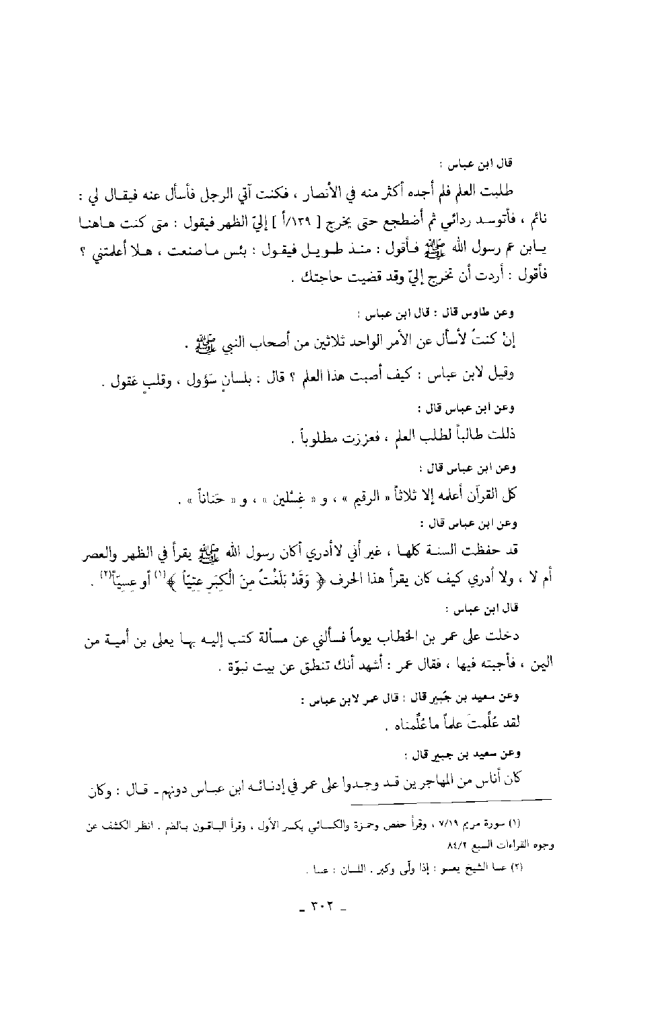 وعن ابن عباس قال: قد حفظت السنة كلها، غير أني لا أدري أكان رسول الله صَلَّى اللهُ عَلَيْهِ وَسَلَّمَ يقرأ في الظهر والعصر أم لا، ولا أدري كيف كان يقرأ هذا الحرف " وقد بلغت من الكبر عتياً " أو عسياً.