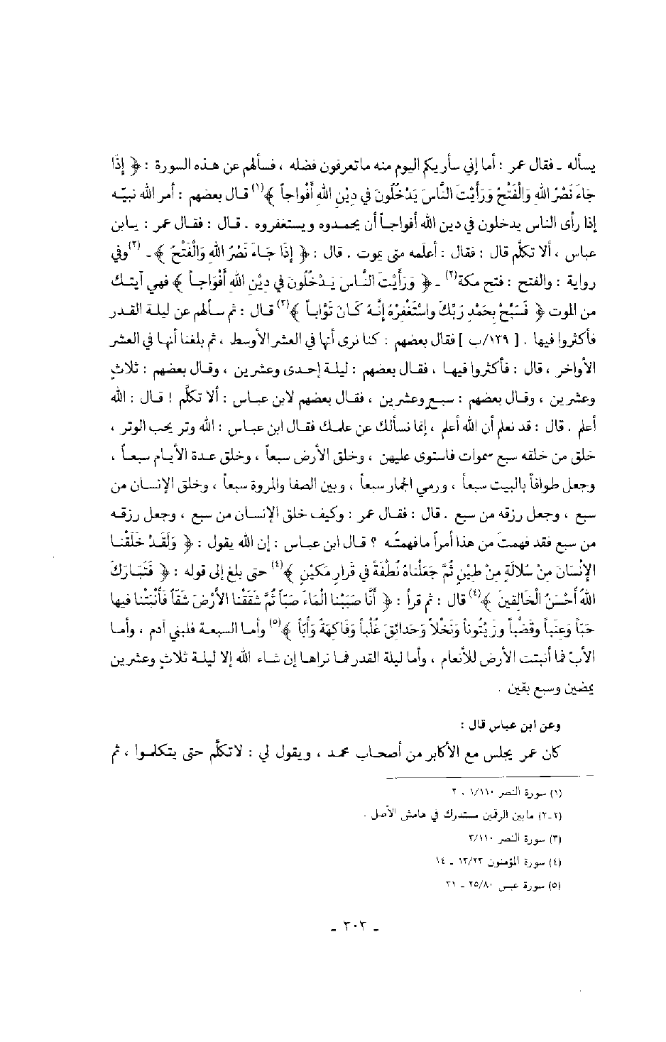 يسأله فقال عمر: أما إني سأريكم اليوم منه ما تعرفون فضله، فسألهم عن هذه الصورة: " إذا جاء نصر الله والفتح ورأيت الناس يدخلون في دين الله أفواجا " قال بعضهم: أمر الله نبيه إذا رأى الناس يدخلون في دين الله أفواجاً أن يحمدوه ويستغفروه. قال: فقال عمر: يا بن عباس، ألا تكلم قال: فقال: أعلمه من يموت. قال: " إذا جاء نصر الله والفتح " وفي رواية: والفتح فتح مكة " ورأيت الناس يدخلون في دين الله أفواجا " فهي آيتك من الموت: فسبح بحمد ربك واستغفره إنه كان توابا " قال: ثم سألهم عن ليلة القدر فأكثروا فيها. فقال بعضهم: كنا نرى أنها في العشر الأوسط، ثم بلغنا أنها في العشر الأواخر، قال: فأكثروا فيها، فقال بعضهم: ليلة إحدى وعشرين، وقال بعضهم: ثلاث وعشرين، وقال بعضهم: سبع وعشرين، فقال بعضهم لابن عباس: ألا تكلم! قال: الله أعلم. قال: قد نعلم أن الله أعلم، إنما نسألك عن علمك فقال ابن عباس: الله وتر يحب الوتر، خلق من خلقه سبع سموات فاستوى عليهن، وخلق الأرض سبعاً، وخلق عدة الأيام سبعاً، ورمي الجمار سبعاً، وبين الصفا والمروى سبعاً، وخلق الإنسان من سبع، وجعل رزقه من سبع. قال: فقال عمر: وكيف خلق الإنسان من سبع، وجعل رزقه من سبع فقد فهمت من هذا الأمر ما فهمته؟ قال ابن عباس: إن الله يقول: " ولقد خلقنا الإنسان من سلالة من طين ثم جعلناه نطفة في قرار مكين " حتى بلغ إلى قوله: " فتبارك الله أحسن الخالقين " قال: ثم قرأ: " أنا صببنا الماء صباً ثم شققنا الأرض شقاً فأنبتنا فيها حباً وعنباً وقضباً وزيتوناً ونخلاً وحدائق غلباً وفاكهة وأباً " وأما السبعة فلبني آدم، وأما الأب فما أنبتت الأرض للأنعام، وأما ليلة القدر فما نراها إن شاء الله إلا ليلة ثلاث وعشرين يمضين وسبع بقين.