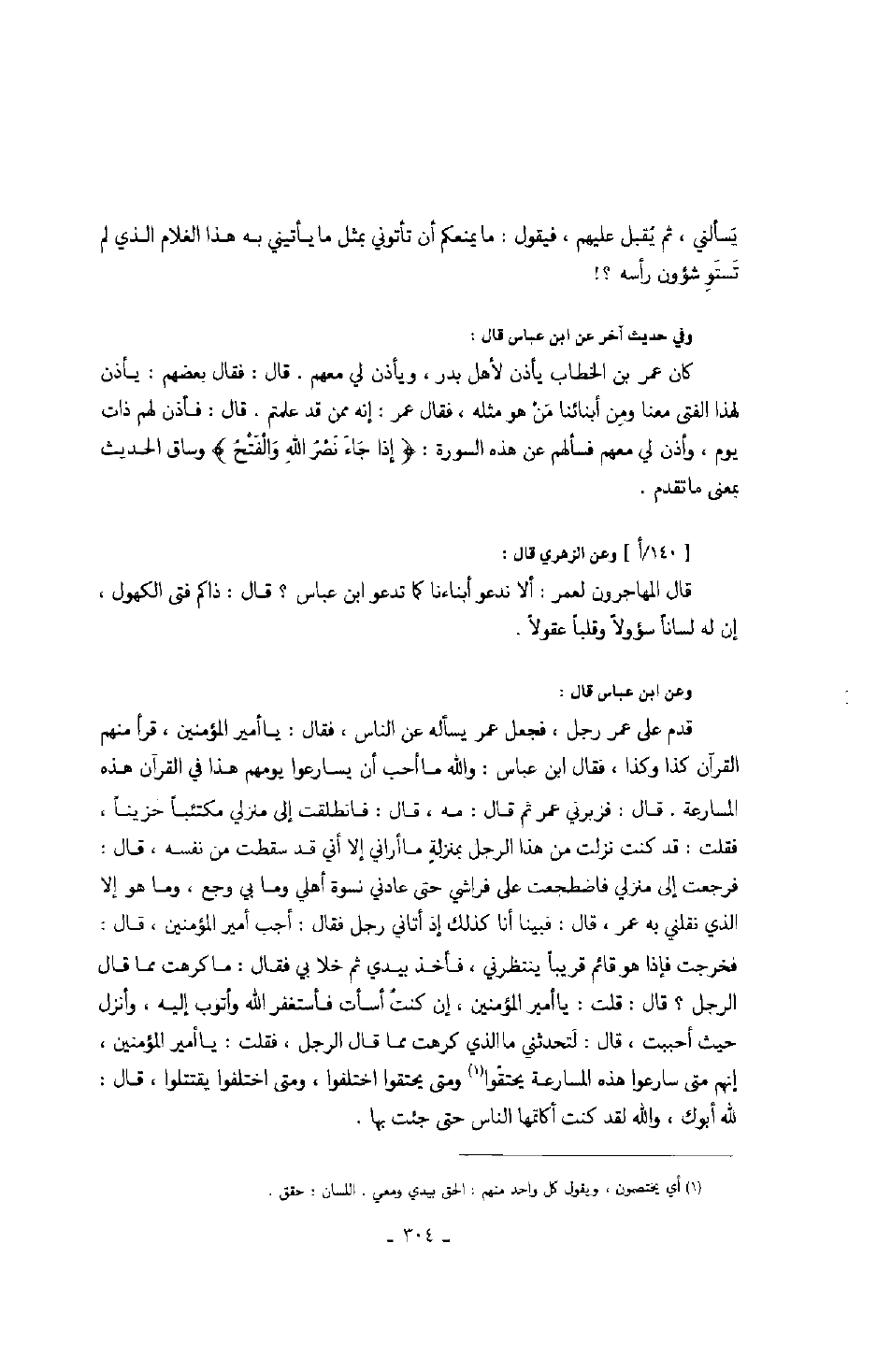 يسألني، ثم يقبل عليهم فيقول: ما يمنعكم أن تأتونيبمثل ما يأتيني به هذا الغلام الذي لم تستو شؤون رأسه؟! وفي حديث آخر عن ابن عباس قال: كان عمر بن الخطاب يأذن لأهل بدر، ويأذن لي معهم. فقال بعضهم: يأذن لهذا الفتى معنا ومن أبنائنا من هو مثله، فقال عمر: إنه ممن قد علمتم. قال: فأذن لهم ذات يوم، وأذن لي معهم فسألهم عن هذه السورة: " إذا جاء نصر الله والفتح " وساق الحديث بمعنى ما تقدم.