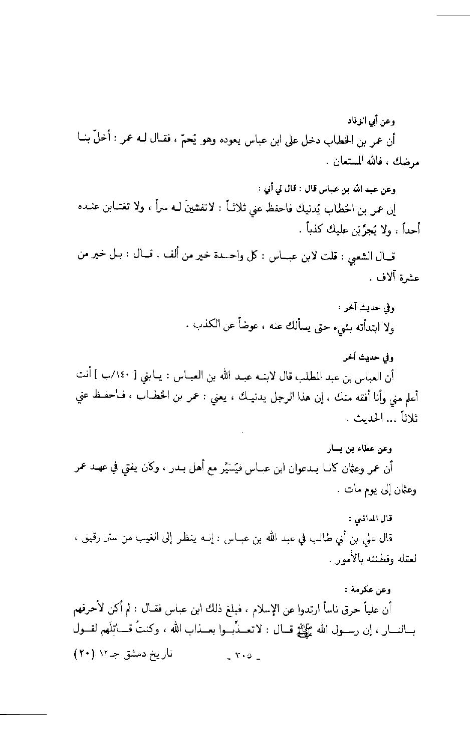 وفي حديث آخر: أن العباس بن عبد المطلب قال لابنه عبد الله بن العباس: يا بني أنت أعلم مني وأنا أفقه منك، إن هذا الرجل يدنيك، يعني: عمر بن الخطاب، فاحفظ عني ثلاثاً الحديث.