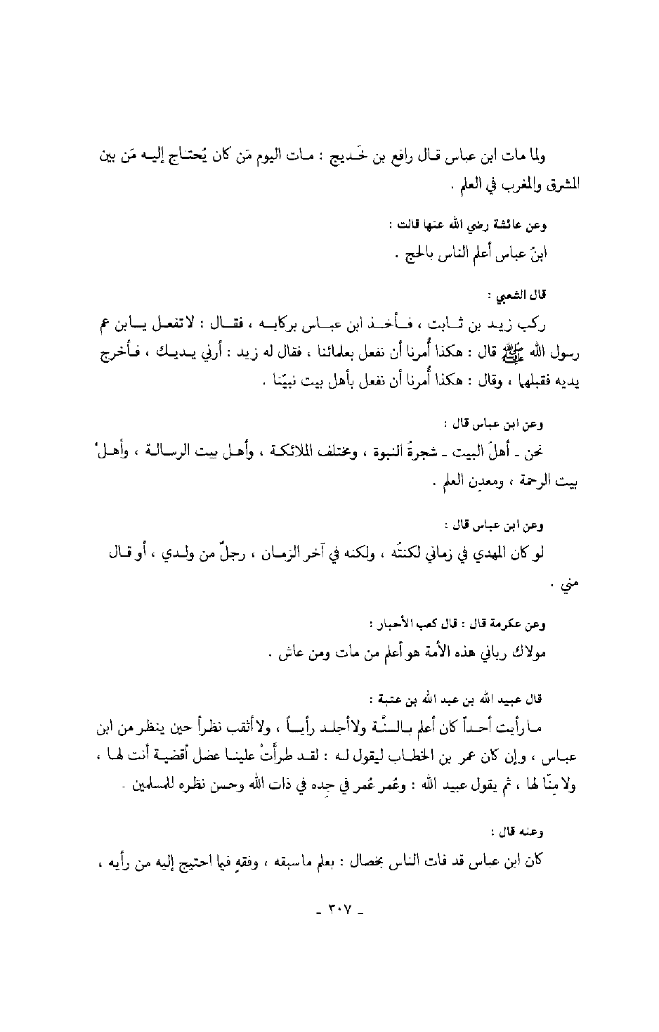 قال الشعبي: ركب زيد بن ثابت، فأخذ ابن عباس بركابه، فقال: لا تفعل يابن عم رسول الله صَلَّى اللهُ عَلَيْهِ وَسَلَّمَ قال: هكذا أمرنا أن نفعل بعلمائنا، فقال له زيد: أرني يديك، فأخرج يديه فقبلهما، وقال: هكذا أمرنا أن نفعل بأهل بيت نبينا.