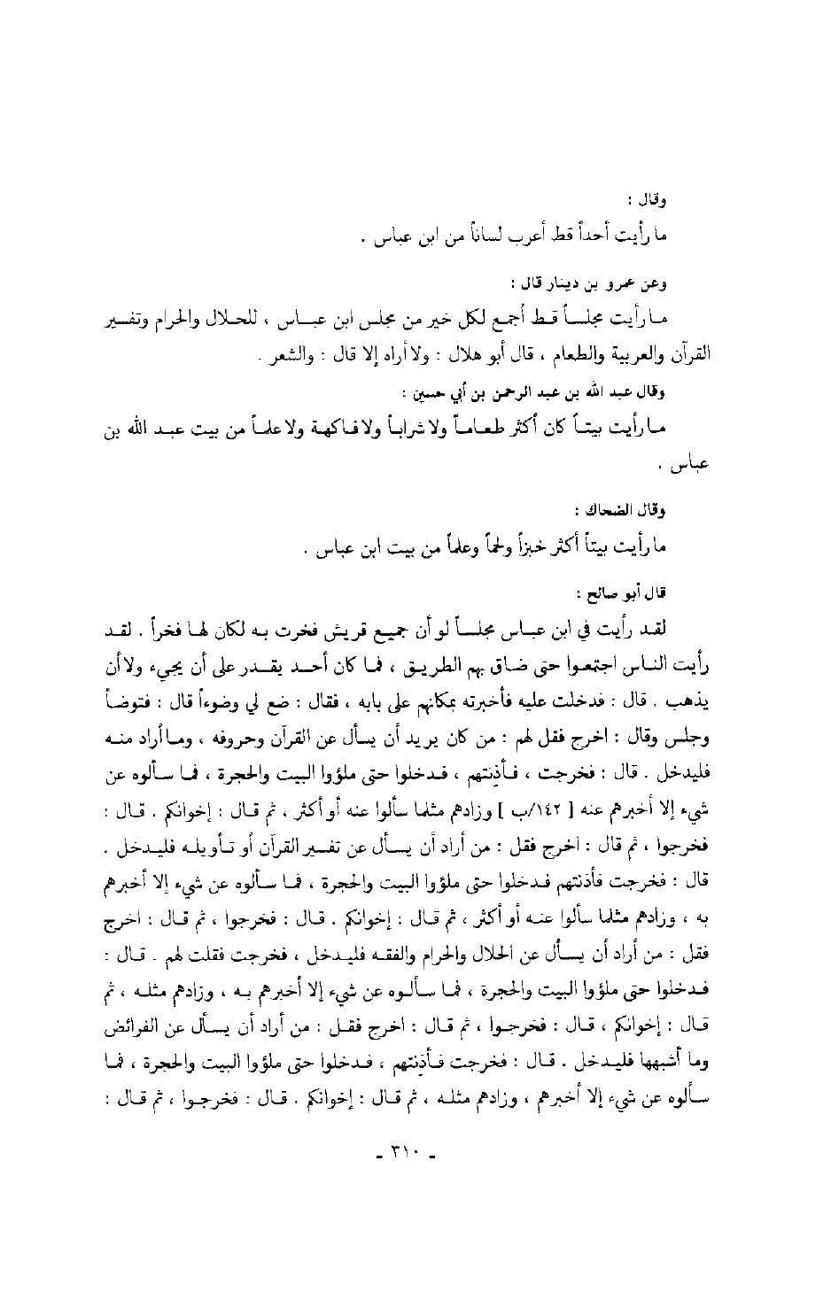 وعن عمرو بن دينار قال: ما رأيت مجلساً قط أجمع لكل خير من مجلس ابن عباس، للحلال والحرام وتفسير القرآن والعربية والطعام، قال أبو هلال: ولا أراه إلا قال: والشعر.
