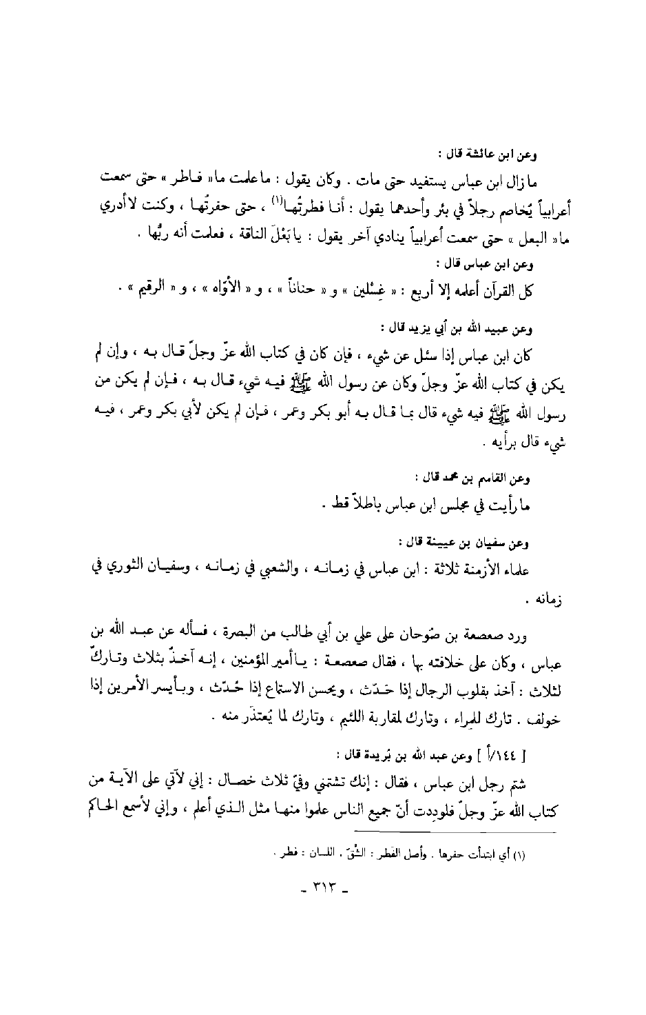 وعن ابن عائشة قال: ما زال ابن عباس يستفيد حتى مات. وكان يقول: ما علمت ما " فاطر " حتى سمعت أعرابياً يخاصم رجلاً في بئر واحدهما يقول: أنا فطرتها، وكنت لا أدري ماء البعل حتى سمعت أعرابياً ينادي آخر يقول: يا بعل الناقة، فعلمت أنه ربها.
