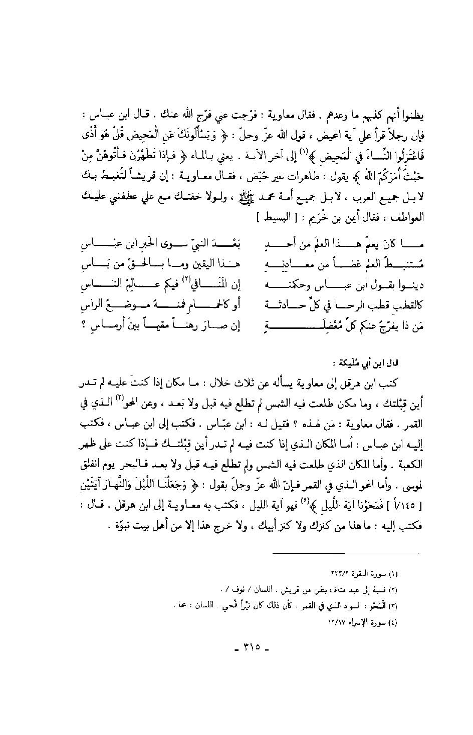 يظنوا أنهم كذبهم ما وعدهم! إن لهاتين الآيتين تأويلاً ما نعلمه. قال ابن عباس: أما يونس عله السلام فظن أن خطيئته لم تبلغ أن يقدر الله عليه تلك البلية، ولم يشك أن الله عز وجل إذا أراده قدر عليه. وأما قوله: حتى إذا استيأس الرسل من إيمان قومهم، وظن من أعطاهم الرضا في العلانية أن يكذبهم في السريرة، وذلك أطول البلاء عليهم، ولم يستيئس الرسل من نصر الله، ولم يظنوا أنهم كذبهم ما وعدهم. فقال معاوية: فرجت عني فرج الله عنك. قال ابن عباس فإن رجلاً قرأ علي آية المحيض، قول الله عز وجل: " ويسألونك عن المحيض قل هو أذى فاعتزلوا النساء في المحيض " إلى آخر الآية. يعني بالماء " فإذا تطهرن فأتوهن من حيث أمركم الله " يقول: طاهرات غير حيض، فقال معاوية: إن قريشاً لتغبط بك لا بل جميع العرب، لا بل جميع أمة محمد صَلَّى اللهُ عَلَيْهِ وَسَلَّمَ، ولولا خفتك مع علي عطفتني عليك العواطف، فقال أيمن بن خريم: البسيط