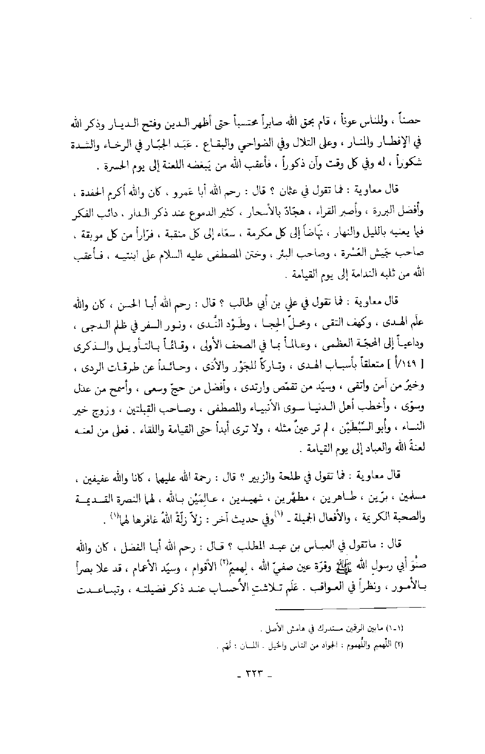 قال: ما تقول في العباس بن عبد المطلب؟ قال: رحم الله أبا الفضل، كان والله صنو أبي رسول الله صَلَّى اللهُ عَلَيْهِ وَسَلَّمَ وقرة عين صفي الله، لهميم الأقوام، وسيد الأعمام، قد علا بصراً للأمور، ونظراً في العواقب. علم تلاشت الأحساب عند ذكر فضيلته، وتباعدت
