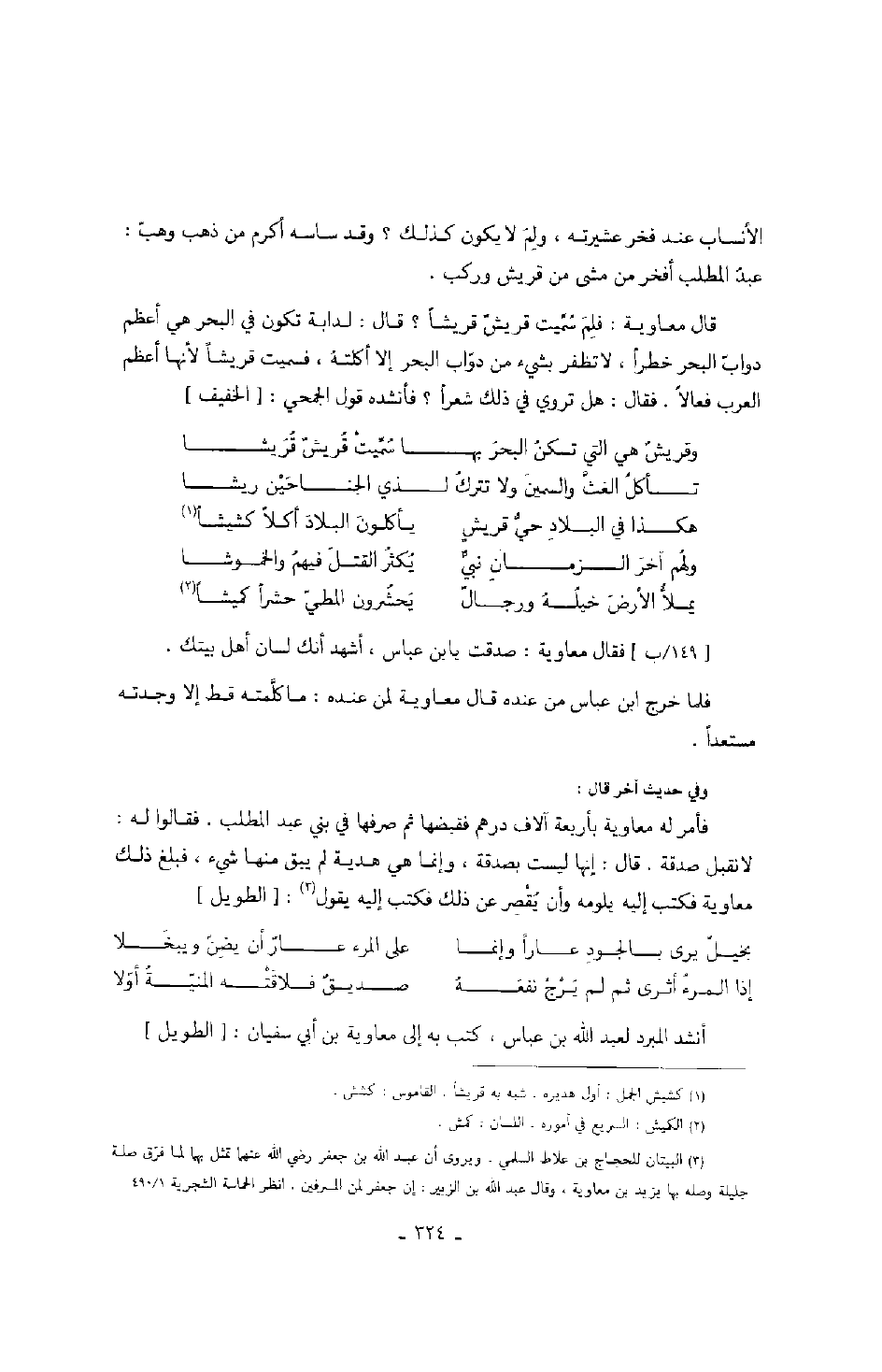 قال معاوية: فلما سميت قريش قريشاً؟ قال: لدابة تكون في البحر هي أعظم دواب البحر خطراً، لا تظفر بشيء من دواب البحر إلا أكلته، فسميت قريش لأنها أعظم العرب فعالاً. فقال: هل تروي في ذلك شعراً؟ فأنشده قول الجمحي: