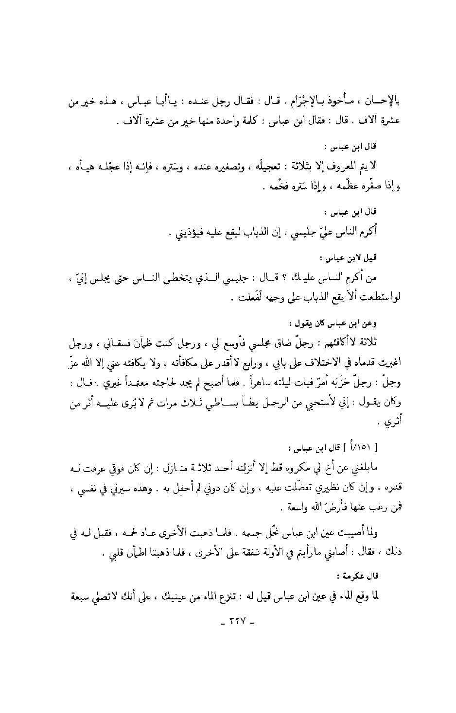 وعن ابن عباس كان يقول: ثلاثة لا أكافئهم: رجل ضاق مجلسي فأوسع لي، ورجل كنت ظمآن فسقاني، ورجل اغبرت قدماه في الاختلاف على بابي، ورابع لا أقدر على مكافأته، ولا يكافئه عني إلا الله عز وجل: رجل حز به أمر فبات ليلته ساهراً. فلما أصبح لم يجد لحاجته معتمداً غيري. قال: وكان يقول: إني لأستحي من الرجل يطأ بساطي ثلاث مرات ثم لا يرى عليه أثر من أثري.