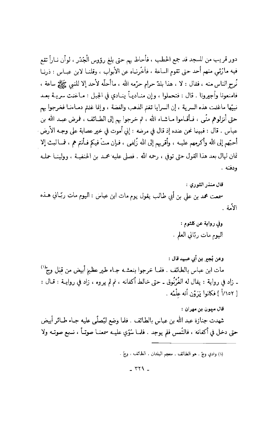 دور قريب من المسجد قد جمع الحطب، فأحاط بهم حتى بلغ رؤوس الجدر، لو أن ناراً تقع فيه مارئي منهم أحد حتى تقوم الساعة، فأخرناه عن الأبواب، وقلنا لابن عباس: ذرنا نرح الناس منه، فقال: لا، هذا بلد حرام حرمه الله، ما أحله لأحد إلا للنبي صَلَّى اللهُ عَلَيْهِ وَسَلَّمَ ساعة، فامنعونا وأجيرونا. قال: فتحملوا، وإن منادياً ينادي في الجبل: ما غنمت سرية بعد نبيها ما غنمت هذه السرية، إن السرايا تغنم الذهب والفضة، وإنما غنمتم دماءنا فخرجوا بهم حتى أنزلوهم منى، فأقاموا ما شاء الله، ثم خرجوا بهم إلى الطائف، فمرض عبد الله بن عباس. قال: فبينا نحن عنده إذ قال في مرضه: إني أموت في خير عصابة على وجه الأرض أحبهم إلى الله وأكرمهم عليه، وأقربهم إلى الله زلفى، فإن كت فيكم فأنتم هم، فما لبث إلا ثمان ليال بعد هذا القول حتى توفي، رحمه الله. فصلى عليه محمد بن الحنيفة، وولينا حمله ودفنه.