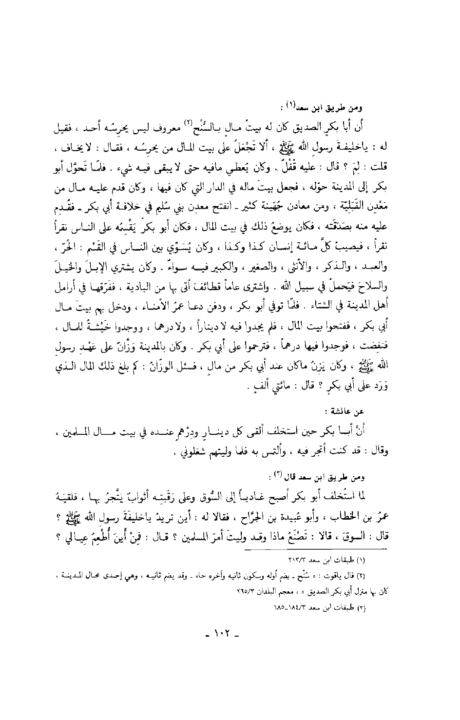 ومن طريق ابن سعد: أن أبا بكرٍ الصديق كان له بيت مالٍ بالسنح معروف ليس يحرسه أحد، فقيل له: يا خليفة رسول الله صَلَّى اللهُ عَلَيْهِ وَسَلَّمَ، ألا تجعل على بيت المال من يحرسه، فقال: لا يخاف، قلت: لم؟ قال: عليه قفل، وكان يعطي ما فيه لا يبقى فيه شيء، فلما تحول أبو بكر إلى المدينة حوله، فجعل بيت ماله في الدار التي كان فيها، وكان قدم عليه مال من معدن القبلية ومن معادن جهينة كثير - انفتح معدن بني سُليم في خلافة أبي بكر - فَقُدم عليه منه بصدقته، فكان يوضع ذلك في بيت المال، فكان أبو بكر يقسمه على الناس نقراً نقراً، فيصيب كل مائة إنسان كذا وكذا، وكان يسوي بين الناس في القسم: الحر، والعبد، والذكر، والأنثى، والصغير، والكبير فيه سواء. وكان يشتري الإبل والخيل والسلاح فيحمل في سبيل الله، واشترى عاماً قطائف أتى بها من البادية، ففرّقها في أرامل أهل المدينة في الشتاء، فلما توفي أبو بكر، ودفن دعا عمر الأمناء، ودخل بهم بيت مال أبي بكر، ففتحوا بيت المال، فلم يجدوا فيه لا ديناراً، ولا درهماً، ووجدوا خيشةً للمال، فنفضت فوجدوا فيها درهماً، فترحموا على أبي بكر، وكان بالمدينة وزّان على عهد رسول الله صَلَّى اللهُ عَلَيْهِ وَسَلَّمَ وكان يزن ما كان عند أبي بكر من مالٍ، فسئل الوزّان: كم بلغ ذلك المال الذي ورد على أبي بكر؟ قال: مائتي ألف.