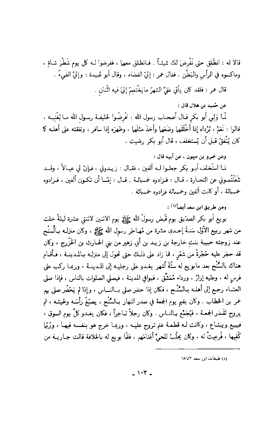 عن حميد بن هلال قال: لما ولي أبو بكرٍ قال أصحاب رسول الله: افرضوا لخليفة رسول الله ما يغنيه، قالوا: نعم، برداه إذا أخلقهما وضعهما وأخذ مثلهما، وظهره إذا سافر، ونفقته على أهله كما كان ينفق قبل أن يستخلف، قال أبو بكر رضيت.