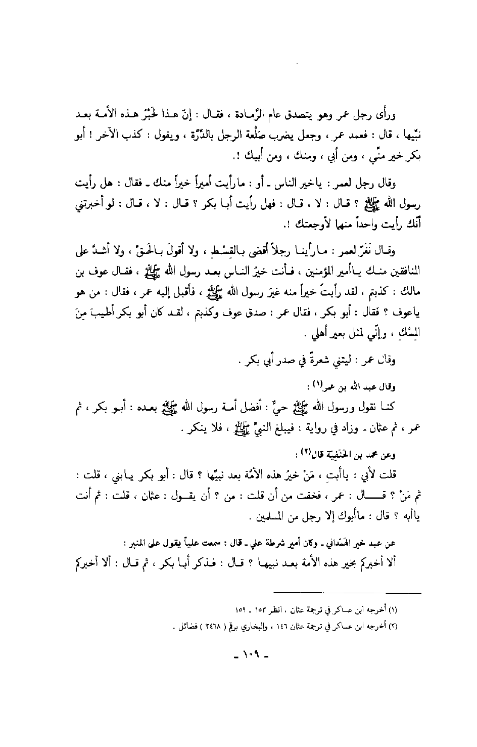 وقال عبد الله بن عمر: كنا نقول ورسول الله صَلَّى اللهُ عَلَيْهِ وَسَلَّمَ حي: أفضل أمة رسول الله صَلَّى اللهُ عَلَيْهِ وَسَلَّمَ بعده: أبو بكر، ثم عمر، ثم عثمان - وزاد في رواية: فيبلغ النبي صَلَّى اللهُ عَلَيْهِ وَسَلَّمَ، فلا ينكر.