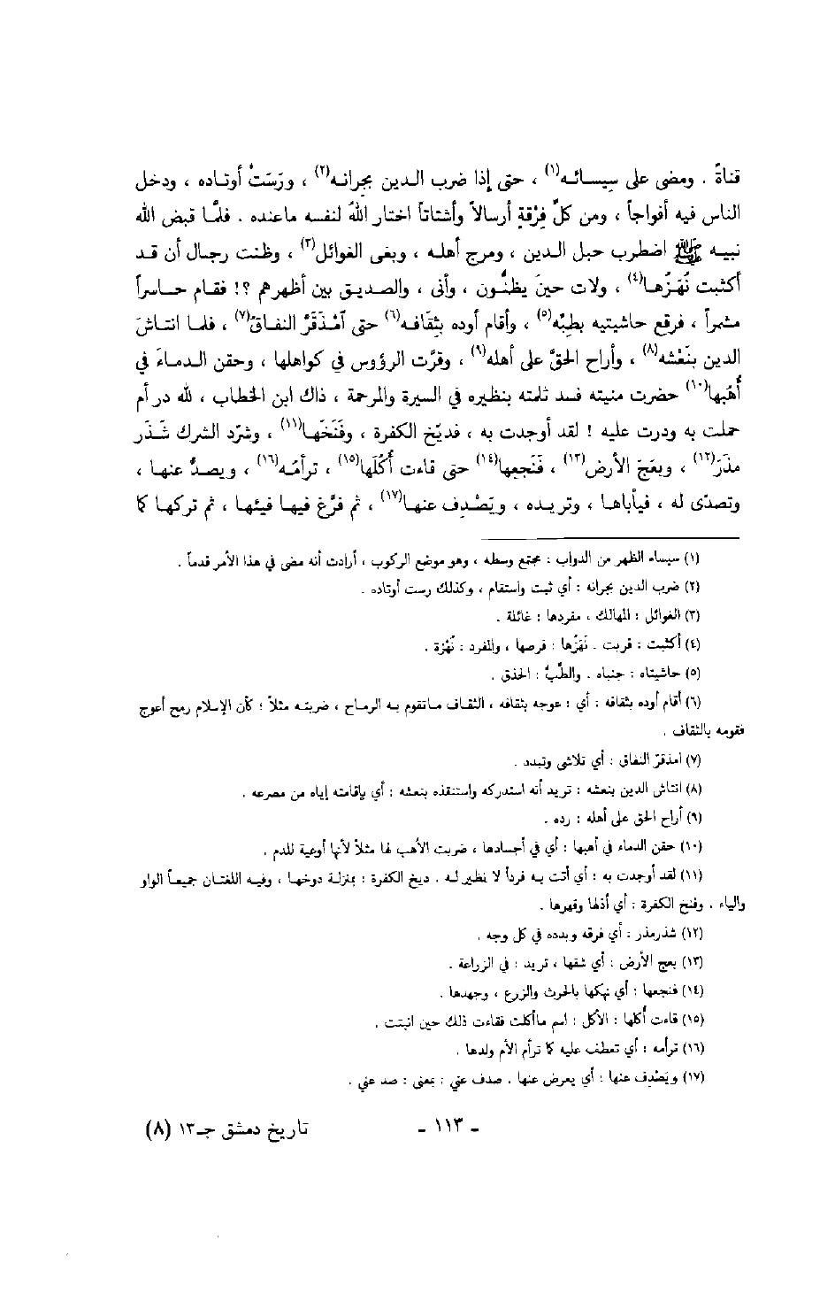 قناةً، ومضى على سيسائه، حتى إذا ضرب الدين بجرانه، ورست أوتاده، ودخل الناس فيه أفواجاً، ومن كل فرقةٍ أرسالاً وأشتاتاً اختار الله لنفسه ما عنده، فلما قبض الله نبيه صَلَّى اللهُ عَلَيْهِ وَسَلَّمَ اضطرب حبل الدين، ومرج أهله، وبغى الغوائل، وظنت رجال أن قد أكثبت نُهَزُها، ولات حين يظنون، وأنى، والصديق بين أظهرهم؟! فقام حاسراً مشمراً، فرقع حاشيتيه بطبه، وأقام أوده بثقافه حتى امذقر النفاق، فلما انتاش الدين بنعشه، وأراح الحق على أهله، وقرت الرؤوس في كواهلها، وحقن الدماء في أهبها حضرت منيته فسد ثلمته بنظيره في السيرة والمرحمة، ذاك ابن الخطاب، لله در أم حملت به ودرت عليه! لقد أوجدت به، فديّخ الكفرة وفنخها، وشرد الشرك شذر مذر، وبعج الأرض فنجعها حتى قاءت أكلها، ترأمه ويصد عنها، وتصدّى له، فيأباها، وتريده ويصدف عنها، ثم فرغ فيئها، ثم تركها كما
