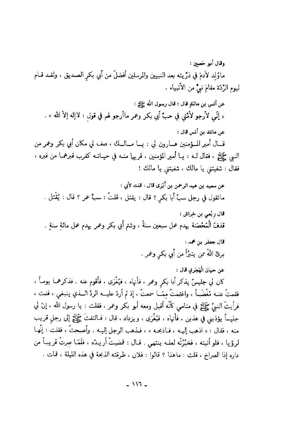 عن مالك بن أنس قال: قال أمير المؤمنين هارون لي: يا مالك، صف لي مكان أبي بكر وعمر من النبي صَلَّى اللهُ عَلَيْهِ وَسَلَّمَ، فقال له: يا أمير المؤمنين قربهما منه في حياته كقرب قبرهما من قبره، فقال: شفيتني يا مالك، شفيتني يا مالك!