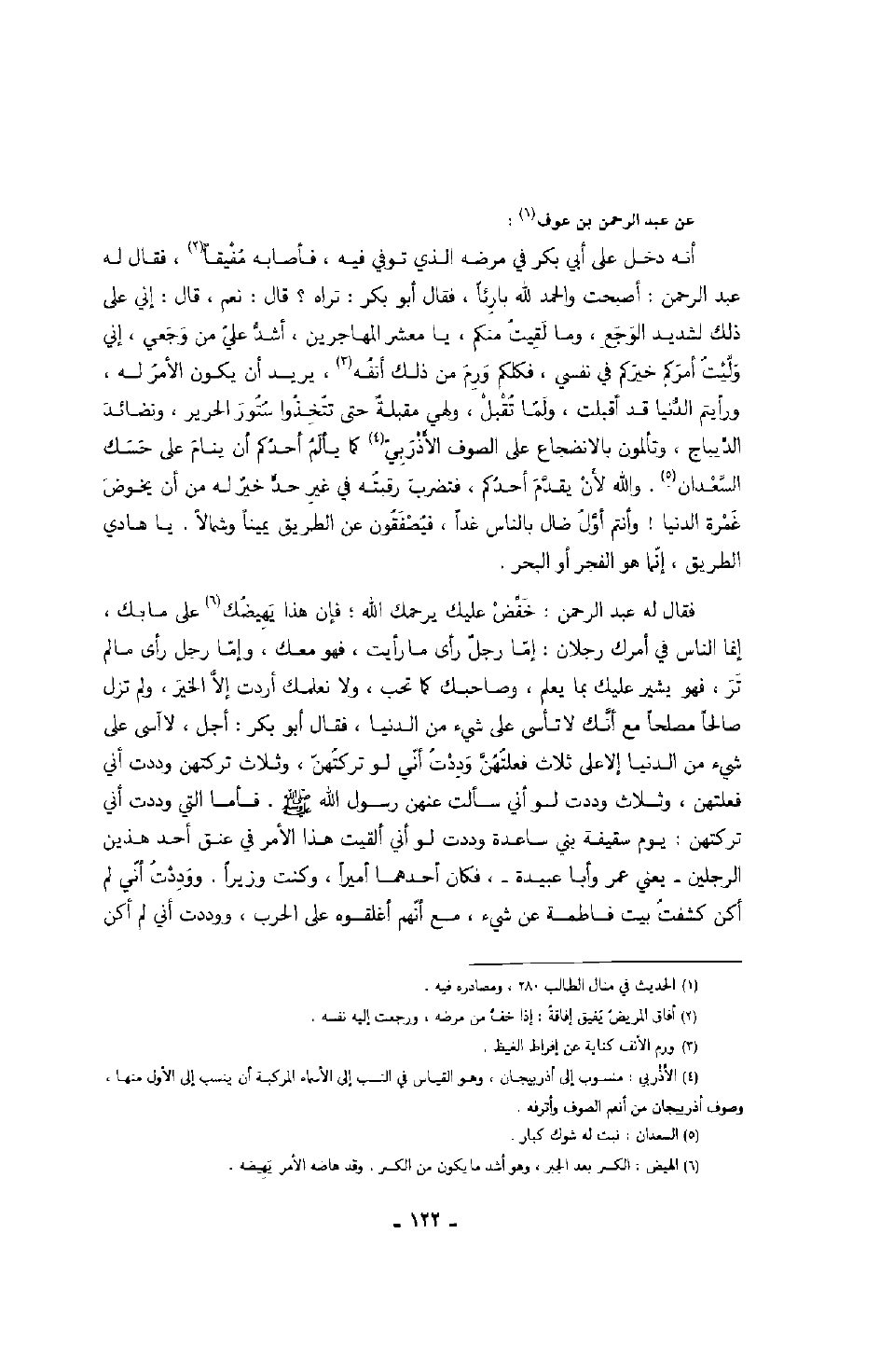 عن عبد الرحمن بن عوف: أنه دخل على أبي في مرضه الذي توفي فيه، فأصابه مفيقاً، فقال له عبد الرحمن: أصبحت والحمد لله بارئاً، فقال أبو بكر: تراه؟ قال: نعم، قال: إني على ذلك لشديد الوجع، وما لقيت منكم، يا معشر المهاجرين، أشد علي من وجعي إني ولّيت أمركم خيركم في نفسي، فكلكم ورم من ذلك أنفه، يريد أن يكون الأمر له، ورأيتم الدنيا قد أقبلت، ولما تقبل، ولهي مقبلة حتى تتخذوا ستور الحرير، ونضائد الديباج، وتألمون بالانضجاع على الصوف الأذربي كما يألم أحدكم أن ينام على حسك السعدان، والله لأن يقدم أحدكم فتضرب رقبته في غير حدٍّ خير له من أن يخوض غمرة الدنيا! وأنتم أول ضال بالناس غداً، فيصفقون عن الطريق يميناً وشمالاً يا هادي الطريق، إنما هو الفجر أو البحر.