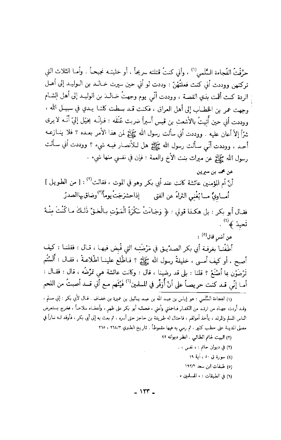 حرقت الفجاءة السلمي، وأني كنت قتلته سريحاً، أو خليته نجيحاً، وأما الثلاث التي تركتهن ووددت أني كنت فعلتهن: وددت لو أني حين سيرت خالد بن الوليد إلى أهل الردة كنت أقمت بذي القصة، ووددت أني يوم وجهت خالد بن الوليد إلى الشام وجهت عمر بن الخطاب إلى العراق، فكنت قد بسطت كلتا يدي في سبيل الله، ووددت أني حين أُتيت بالأشعث بن قيس أسيراً ضربت عنقه، فإنه يخيل إلي أنه لا يرى شراً إلا أعان عليه، ووددت أني سألت رسول الله صَلَّى اللهُ عَلَيْهِ وَسَلَّمَ لمن هذا الأمر بعده؟ فلا ينازعه أحد، ووددت أني سألت رسول الله صَلَّى اللهُ عَلَيْهِ وَسَلَّمَ هل للأنصار فيه شيء؟ ووددت أني سألت رسول الله صَلَّى اللهُ عَلَيْهِ وَسَلَّمَ عن ميراث بنت الأخ والعمة، فإن في نفسي منها شيء.