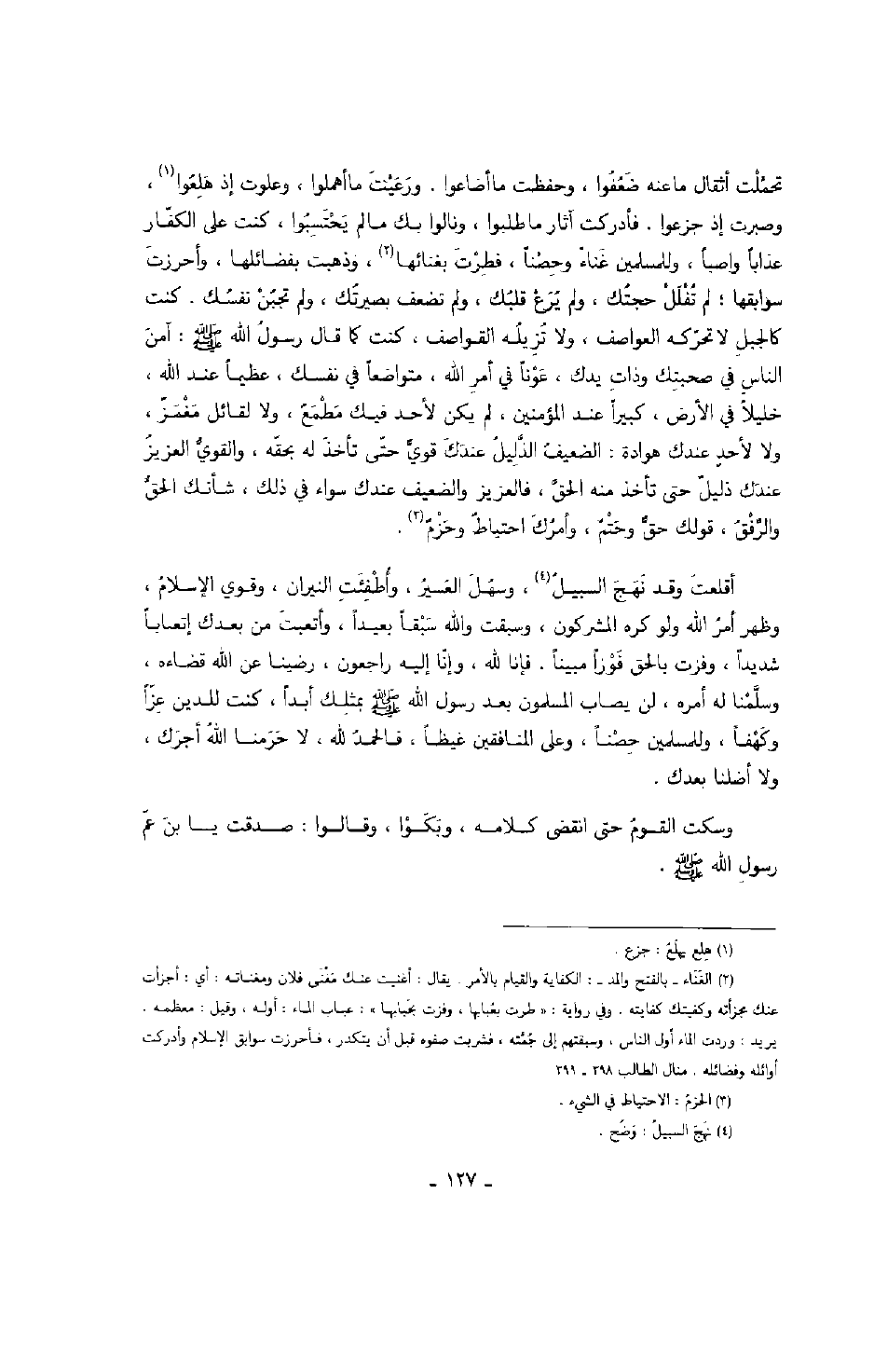 تحملت أثقال ما عنه ضعفوا، وحفظت ما أضاعوا، ورعيت ما أهملوا، وعلوت إذ هلعوا، وصبرت إذ جزعوا، فأدركت آثار ما طلبوا، وناولوا بك ما لم يحتسبوا كنت على الكفار عذاباً واصباً، وللمسلمين غناءً وحصناً، فطرت بغنائها وذهبت بفضائلها، وأحرزت سوابقها: لم تفلل حجتك، ولم يرع قلبك، ولم تضعف بصيرتك، ولم تجبن نفسك، كنت كالجبل لا تحركه العواصف، ولا تزيله القواصف، كنت كما قال رسول الله صَلَّى اللهُ عَلَيْهِ وَسَلَّمَ: آمن الناس في صحبتك وذات يدك، عوناً في أمر الله، متواضعاً في نفسك، عظيماً عند الله، خليلاً في الأرض، كبيراً عند المؤمنين، لم يكن لأحد فيك مطمعاً، ولا لقائل مغمز، ولا لأحدٍ عندك هوادة: الضعيف الذليل عندك قوي حتى تأخذ له بحقه، والقوي العزيز عندك ذليل حتى تأخذ منه الحق، فالعزيز والضعيف عندك سواء في ذلك، شأنك الحق والرفق، قولك حق وحتم، وأمرك احتياط وحزم.