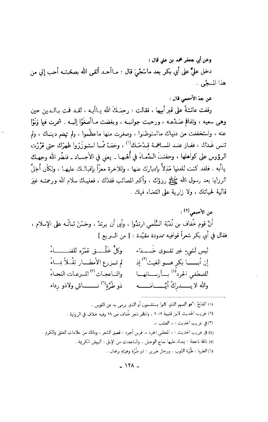 عن جد الأصمعي قال: وقفت عائشة على قبر أبيها فقالت: رحمك الله يا أبه، لقد قمت بالدين حين وهى سعيه، وتفاقم صدعه، ورحبت جوانبه، وبغضت ما أصغوا إليه، شمرت فيما ونوا عنه، واستخففت من دنياك ما استوطنوا، وصغرت منها ما عظموا، ولم تهضم دينك، ولم تنسى غدك، ففاز عند المساهمة قدحك، وخف مما استوزروا ظهرك حتى قررت الرؤوس على كواهلها، وحقنت الدماء في أهبها - يعني في الأجساد - فنضر الله وجهك يا أبه، فلقد كنت للدنيا مذلاً بإدبارك عنها، وللآخرة معزاً بإقبالك عليها، ولكأن أجل الرزايا بعد رسول الله صَلَّى اللهُ عَلَيْهِ وَسَلَّمَ رزؤك، وأكبر المصائب فقدك، فعليك سلام الله ورحمته غير قالية لحياتك، ولا زارية على القضاء فيك.