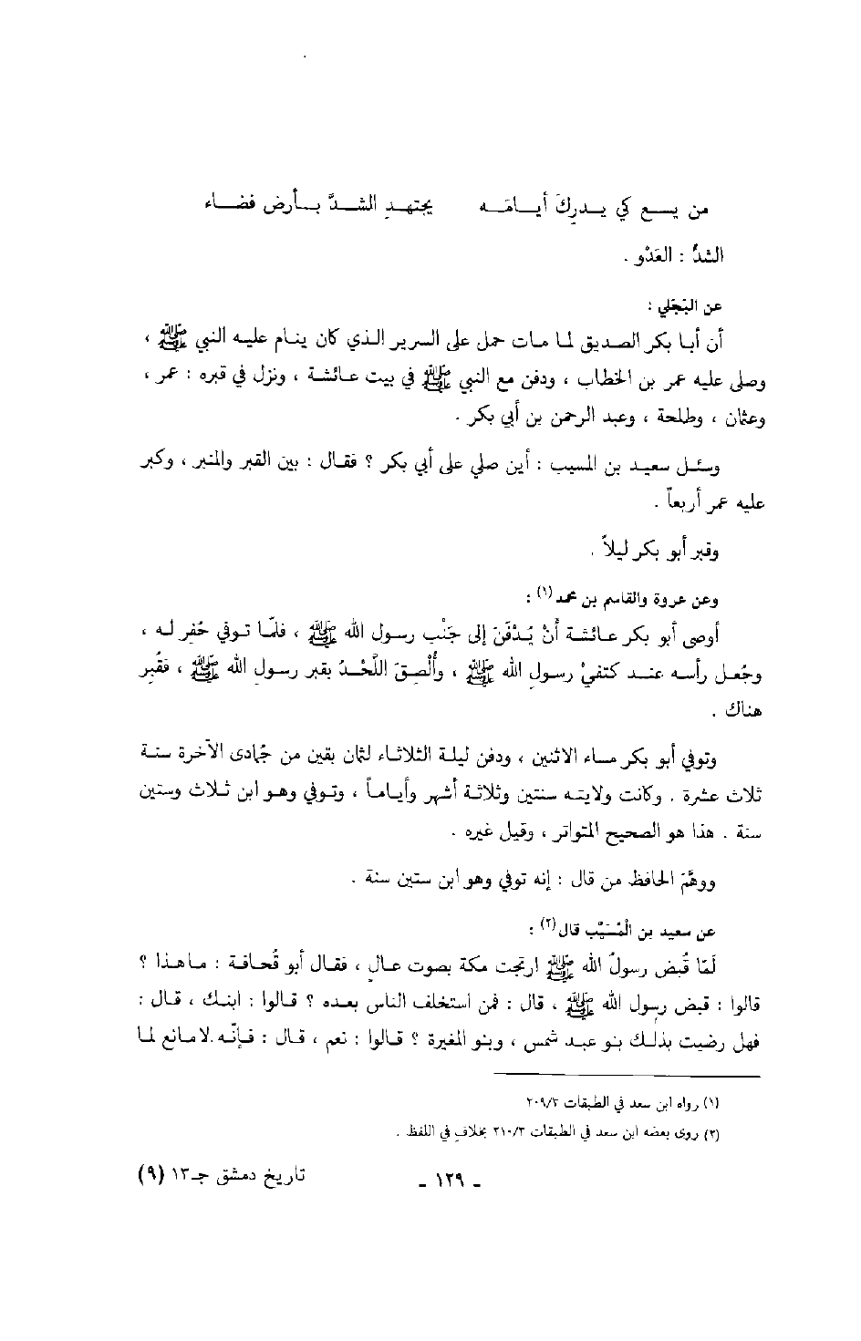 عن سعيد بن المسيب قال: لما قُبض رسول الله صَلَّى اللهُ عَلَيْهِ وَسَلَّمَ ارتجت مكة بصوتٍ عالٍ، فقال أبو قحافة: ما هذا؟ قالوا: قُبض رسول الله صَلَّى اللهُ عَلَيْهِ وَسَلَّمَ، قال: فمن استخلف الناس بعده؟ قالوا: ابنك، قال: فهل رضيت بذلك بنو عبد شمس، وبنو المغيرة؟ قالوا: نعم، قال: فإنه لا مانع لما
