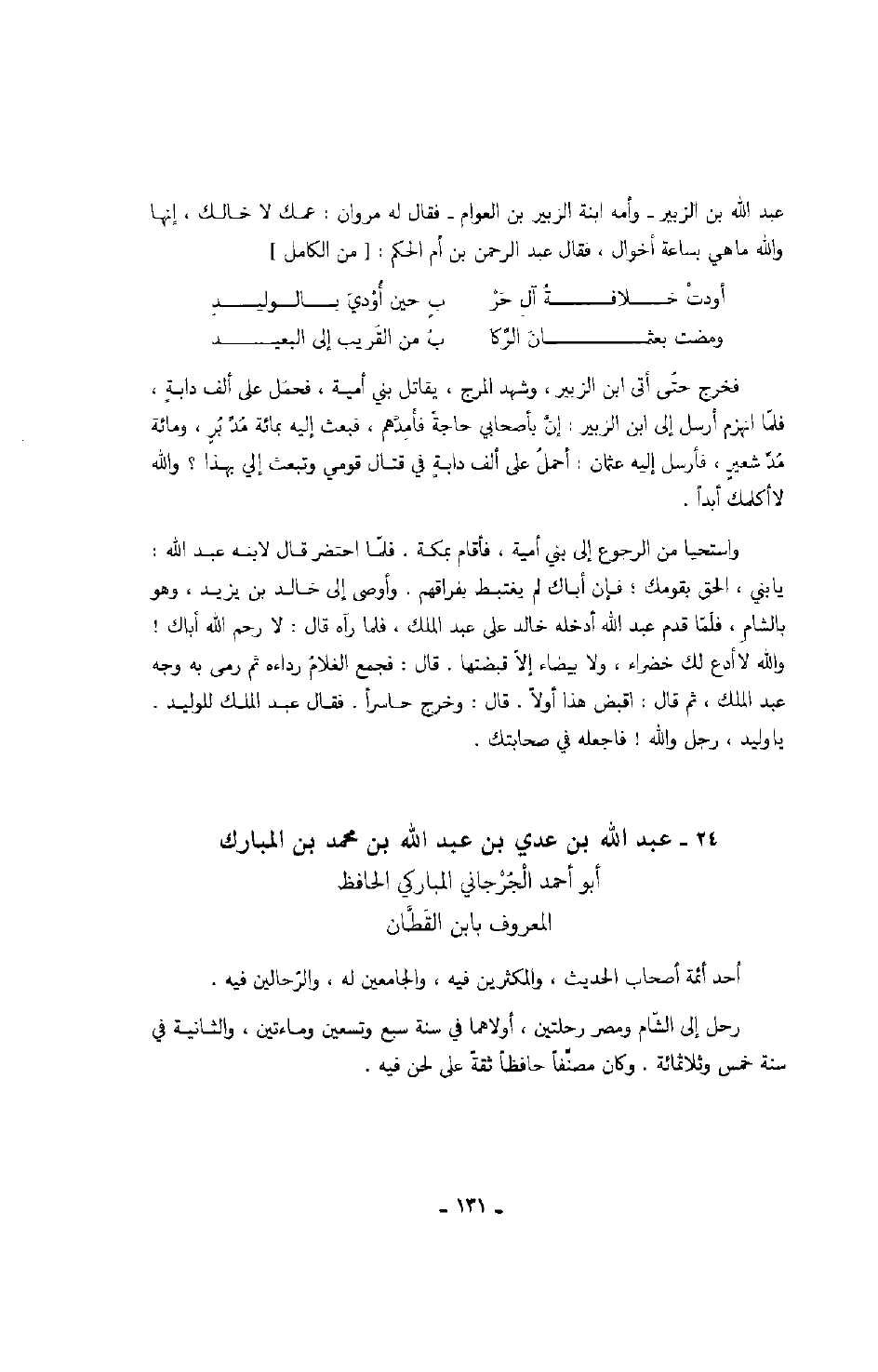 عبد الله بن الزبير - وأمه ابنة الزبير بن العوام - فقال له مروان: عمك لا خالك، إنها والله ما هي بساعة أخوال، فقال عبد الرحمن بن أم الحكم: من الكامل