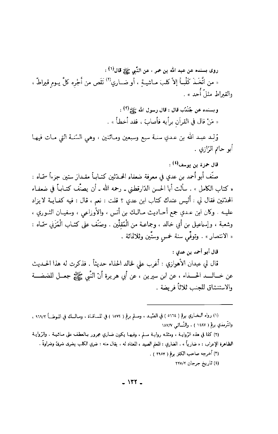 قال حمزة بن يوسف: صنف أبو أحمد بن عدي في معرفة ضعفاء المحدثين كتاباً مقدار ستين جزءاً سماه: كتاب الكامل، سألت أبا الحسن الدارقطني - رحمه الله - أن يصنف كتاباً في ضعفاء المحدثين فقال لي: أليس عندك كتاب ابن عدي؟ قلت: نعم، قال: فيه كفاية لا يزاد عليه، وكان ابن عدي جمع أحاديث مالك بن أنس، والأوزاعي، وسفيان الثوري، وشعبة، وإسماعيل بن أبي خالد، وجماعة من المقلين، وصنف على كتاب المزني سماه: الانتصار، وتوفي سنة خمسٍ وستين وثلاثمائة.