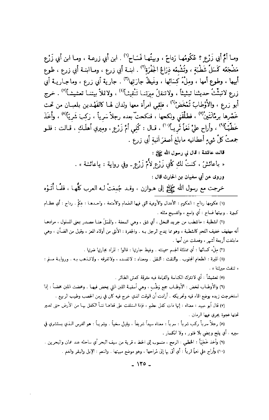 وما أم أبي زرعٍ؟ عكومها رداح، وبيتها فساح، ابن أبي زرع، وما ابن أبي زرع، مضجعه كمسل شطبةٍ، وتشبعه ذراع الجفرة، ابنة أبي زرع، وما ابنة أبي زرع، طوع أبيها، وطوع أمها وملء مكسائها، وغيظ جارتها، جارية أبي زرع، وما جارية أبي زرع، لا تبثث حديثنا تبثيثاً، ولا تنقل ميرتنا تنقيثاً، ولا تملأ بيتنا تعشيشاً، خرج أبو زرع، والوطاب تمخض، فلقي امرأة معها ولدان لها كالفهدين يلعبان من تحت خصرها برمانتين، فطلقني ونكحها، فنكحت بعده رجلاً سرياً، ركب شرياً، وأخذ خطياً، وأراح علي نعماً ثرياً، قال: كلي أم زرعٍ، وميري أهلك، قالت: فلو جمعت كل شيءٍ أعطانيه ما بلغ أصغر آنية أبي زرع.