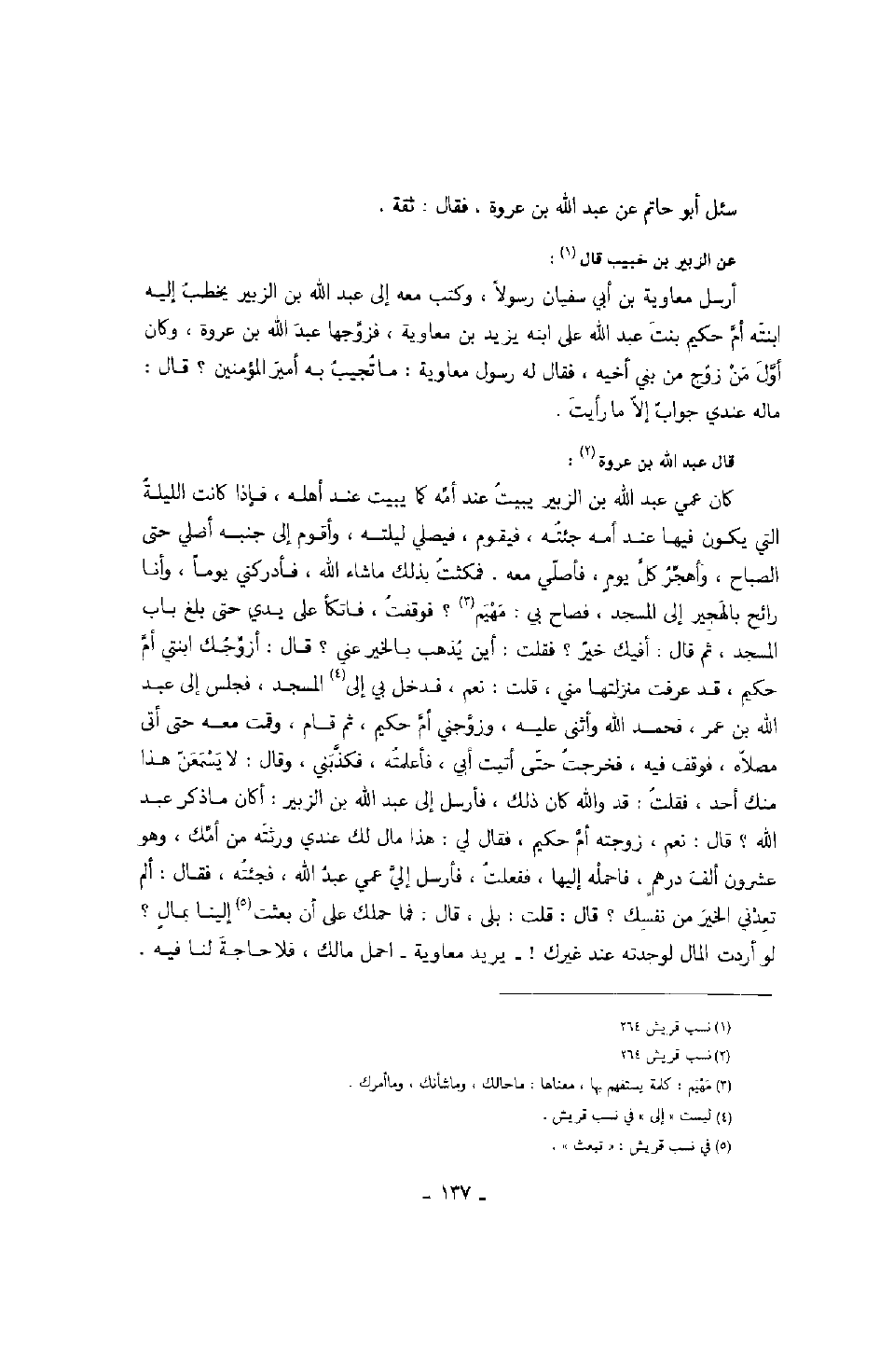 كان عمي عبد الله بن الزبير يبيت عند أمه كما يبيت عند أهله، فإذا كانت الليلة التي يكون فيها عند أمه جئته، فيقوم، فيصلي ليلته، وأقوم إلى جنبه أصلي حتى الصباح، وأهجر كل يومٍ، فأصلي معه، فمكثت بذلك ما شاء الله؛ فأدركني يوماً، وأنا رائح بالهجير إلى المسجد، فصاح بي: مهيم؟ فوقفت، فاتكأ على يدي حتى بلغ باب المسجد. ثم قال: أفيك خير؟ فقلت: أين يُذهب بالخير عني؟ قال: أزوجك ابنتي أم حكيم، قد عرفت منزلتها مني، قلت: نعم، فدخل بي إلى المسجد، فجلس إلى عبد الله بن عمر، فحمد الله وأثنى عليه، وزوجني أم حكيم، ثم قام، وقمت معه حتى أتى مصلاه، فوقف فيه، فخرجت حتى أتيت أبي، فأعلمته، فكذبني، وقال: لا يسمعن هذا منك أحد، فقلت: قد والله كان ذلك، فأرسل إلى عبد الله بن الزبير: أكان ما ذكر عبد الله؟ قال: نعم، زوجته أم حكيم، فقال لي: هذا مال لك عندي ورثته من أمك، وهو عشرون ألف درهمٍ، فأحمله إليها، ففعلت، فأرسل إلي عمي عبد الله، فجئته، فقال: ألم تعدني الخير من نفسك؟ قال: قلت: بلى، قال: فما حملك على أن بعثت إلينا بمالٍ؟ لو أردت المال لوجدته عند غيرك! - يريد معاوية - احمل مالك، فلا حاجة لنا فيه،