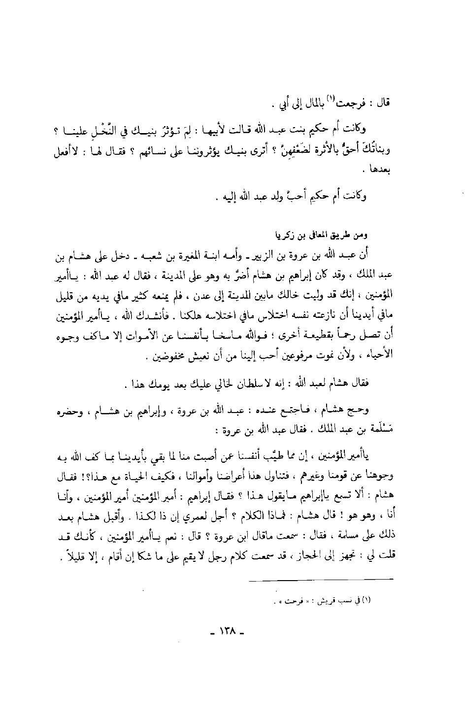 ومن طريق المعافى بن زكريا: أن عبد الله بن عروة بن الزبير - وأمه ابنة المغيرة بن شعبه - دخل على هشام بن عبد الملك، وقد كان إبراهيم بن هشام أضر به وهو على المدينة، فقال له عبد الله: يا أمير المؤمنين، إنك قد وليت خالك ما بين المدينة إلى عدن، فلم يمنعه كثير ما في يديه من قليل ما في أيدينا أن نازعته نفسه اختلاس ما في اختلاسه هلكنا، فأنشدك الله، يا أمير المؤمنين أن تصل رحماً بقطيعة أخرى، فوالله ما سخا بأنفسنا عن الأموات إلا ما كف وجوه الأحياء، ولأن نموت مرفوعين أحب إلينا من أن نعيش مخفوضين.