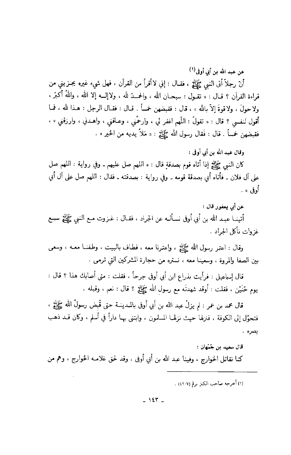 قال إسماعيل: فرأيت بذراع ابن أبي أوفى جرحاً، فقلت: متى أصابك هذا؟ قال: يوم حُنَين، فقلت: أوقد شهدته مع رسول الله صَلَّى اللهُ عَلَيْهِ وَسَلَّمَ؟ قال: نعم، وقبله.