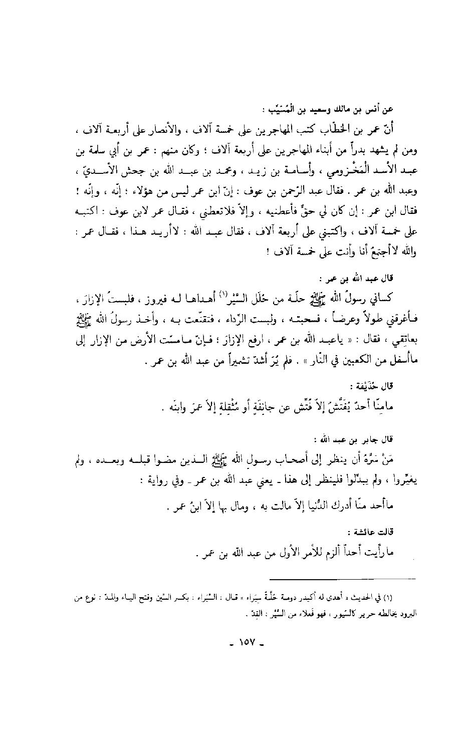 قال عبد الله بن عمر: كساني رسول الله صَلَّى اللهُ عَلَيْهِ وَسَلَّمَ حلة من حلل السير أهداها له فيروز، فلبست الإزار، فأغرقني طولاً وعرضاً، فسجبته، ولبست الرداء، فتقنعت به، وأخذ رسول الله صَلَّى اللهُ عَلَيْهِ وَسَلَّمَ بعاتقي، فقال: " يا عبد الله بن عمر، ارفع الإزار، فإن ما مست الأرض من الإزار إلى ما أسفل من الكعبين في النار "، فلم يُرَ أشد تشميراً من عبد الله بن عمر.