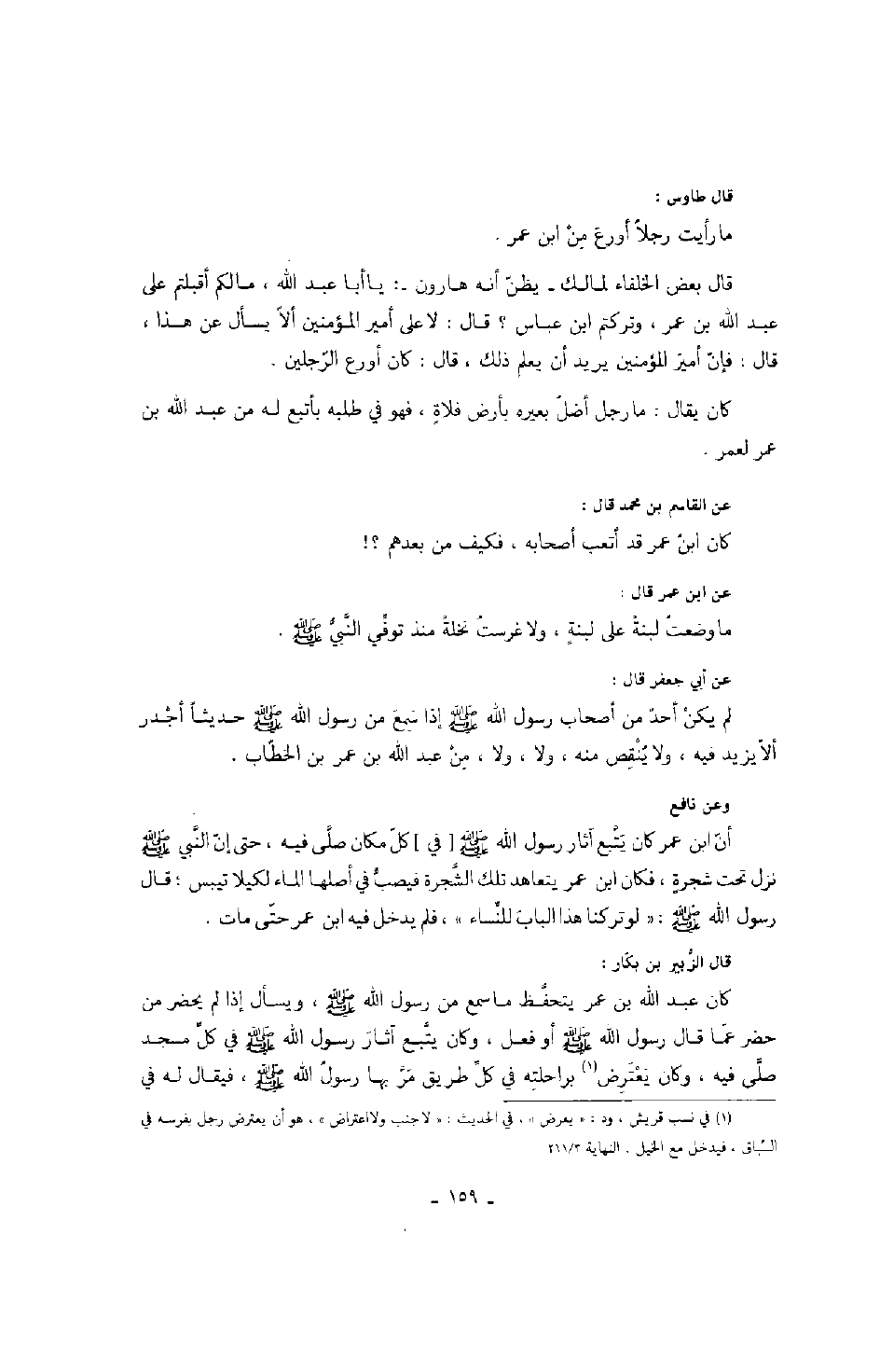 قال الزبير بن بكار: كان عبد الله بن عمر يتحفظ ما سمع من رسول الله صَلَّى اللهُ عَلَيْهِ وَسَلَّمَ، ويسأل إذا لم يحضر من حضر عما قال رسول الله صَلَّى اللهُ عَلَيْهِ وَسَلَّمَ أو فعل، وكان يتبع آثار رسول الله صَلَّى اللهُ عَلَيْهِ وَسَلَّمَ في كل مسجد صلى فيه، وكان يعترض براحلته في كل طريق مر بها رسول الله صَلَّى اللهُ عَلَيْهِ وَسَلَّمَ، فيقال له في