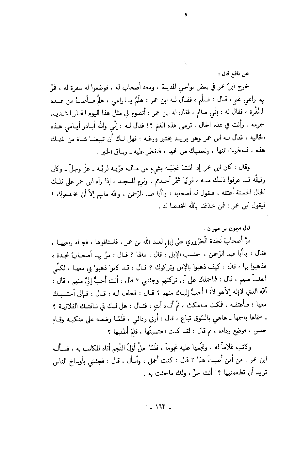 قال ميمون بن مهران: مر أصحاب نجدة الحروري على إبلٍ لعبد الله بن عمر، فاستاقوها، فجاء راعيها، فقال: يا أبا عبد الرحمن، احتسب الإبل، قال: ما لها؟ قال: مر بها أصحاب نجدة، فذهبوا بها، قال: كيف ذهبوا بالإبل وتركوك؟ قال: قد كانوا ذهبوا بي معها، لكني انفلت منهم، فما حملك على أن تركتهم وجئتني؟ قال: أنت أحب إلي منهم، قال: الله الذي لا إله إلا هو لأنا أحب إليك منهم؟ قال: فحلف له، قال: فإني أحتسبك معها؛ فأعتقه، فمكث ما مكث، ثم أتاه آتٍ، فقال: هل لك في ناقتك الفلانية؟ - سماها باسمها - ها هي بالسوق تباع، قال: أرني ردائي، فلما وضعه على منكبه وقام جلس، فوضع رداءه، ثم قال: كنت احتسبتها، فلِمَ أطلبها؟ وكاتب غلاماً له، ونجّمها عليه نجوماً، فلما حل أول النجم أتاه المكاتب به، فسأله ابن عمر: من أين أصبت هذا؟ قال: كنت أعمل وأسأل، قال: فجئتني بأوساخ الناس تريد أن تطعمنيها؟! أنت حر، ولك ما جئت به.