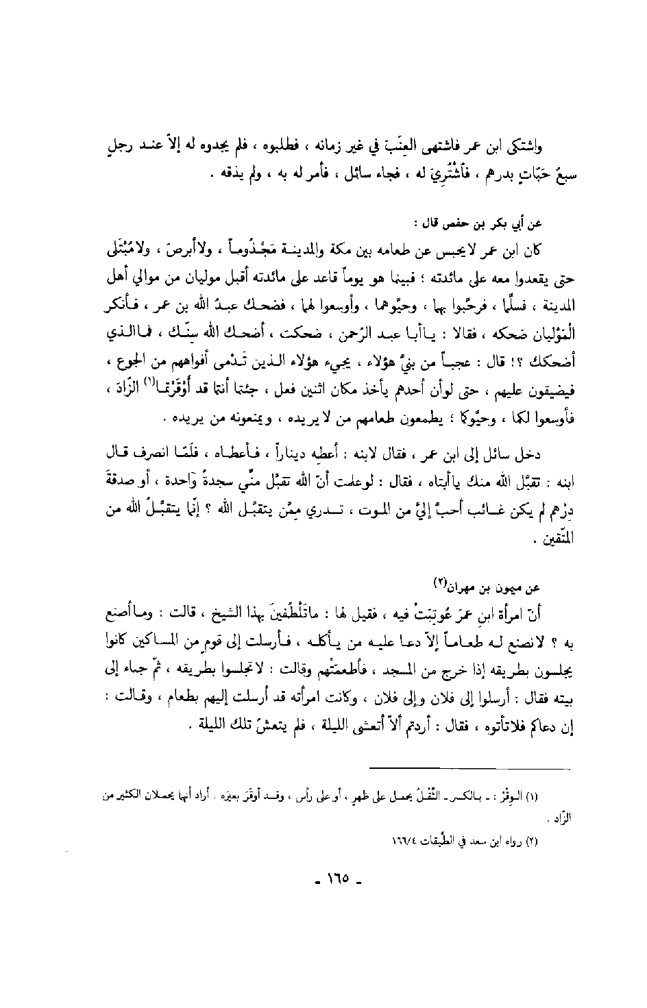 عن أبي بكر بن حفص قال: كان ابن عمر لا يحبس عن طعامه بين مكة والمدينة مجذوماً، ولا أبرص، ولا مبتلى حتى يقعدوا معه على مائدته؛ فبينما هو يوماً قاعداً على مائدته أقبل موليان من موالي أهل المدينة، فسلما، فرحبوا بهما، وحيوهما، وأوسعوا لهما، فضحك عبد الله بن عمر، فأنكر الموليان ضحكه، فقالا: يا أبا عبد الرحمن، ضحكت، أضحك الله سنك، فما الذي أضحكك؟ قال: عجباً من بنيّ هؤلاء، يجيء هؤلاء الذين تدمى أفواههم من الجوع، فيضيقون عليهم، حتى لو أن أحدهم يأخذ مكان اثنين فعل، جئتما أنتما قد أوقرتما الزاد، فأوسعوا لكما، وحيوكما؛ يطعمون طعامهم من لا يريده، ويمنعونه من يريده.
