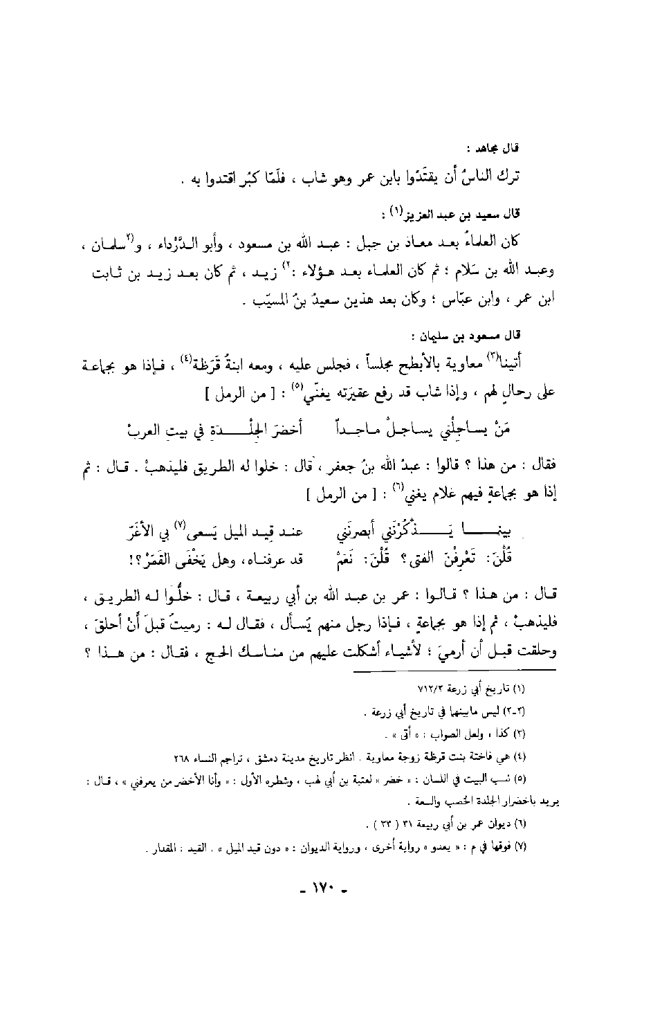 قال مسعود بن سليمان: أتينا معاوية بالأبطح مجلساً، فجلس عليه، ومعه ابنه قرظة، فإذا هو بجماعة على رحالٍ لهم، وإذا شاب قد رفع عقيرته يغني: من الرمل