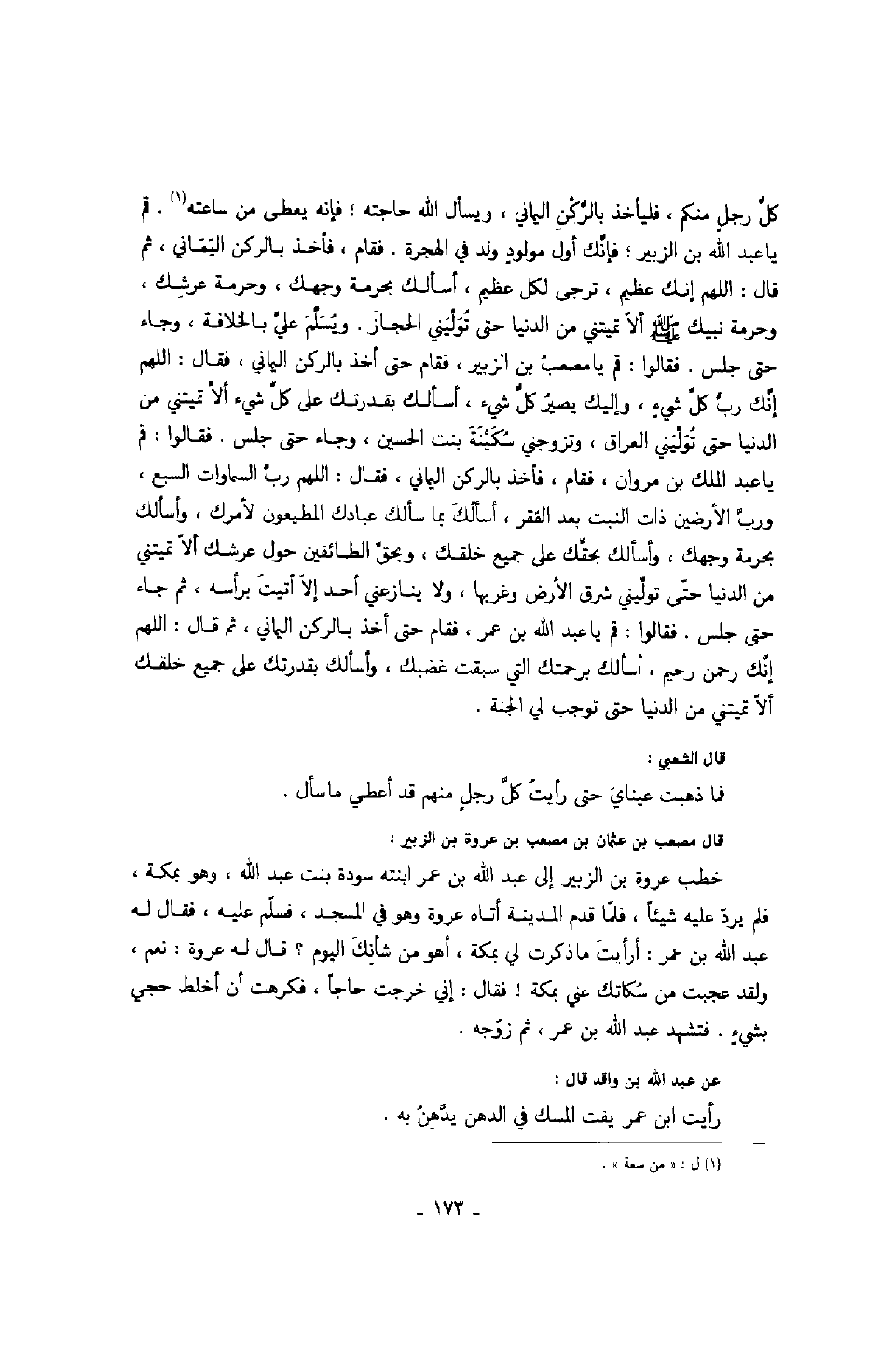 كل رجلٍ منكم، فليأخذ بالركن اليماني، ويسأل الله حاجته؛ فإنه يعطى من ساعته. قم يا عبد الله بن الزبير فإنك أول مولودٍ ولد في الهجرة، فقام، فأخذ بالركن اليماني، ثم قال: اللهم إنك عظيم، ترجى لكل عظيم، أسألك بحرمة وجهك، وحرمة عرشك، وحرمة نبيك صَلَّى اللهُ عَلَيْهِ وَسَلَّمَ ألا تميتني من الدنيا حتى توليني الحجاز، ويسلم عليّ بالخلافة، وجاء حتى جلس، فقالوا: قم يا مصعب بن الزبير، فقام حتى أخذ بالركن اليماني، فقال: اللهم إنك رب كل شيءٍ، وإليك يصير كل شيء، أسألك بقدرتك على كل شيء ألا تميتني من الدنيا حتى توليني العراق، وتزوجني سكينة بنت الحسين، وجاء حتى جلس، فقالوا: قم يا عبد الملك بن مروان، فقام، فأخذ بالركن اليماني، فقال: اللهم رب السموات السبع، ورب الأرضين ذات النبت بعد الفقر، أسألك بما سألك عبادك المطيعون لأمرك، وأسألك بحرمة وجهك، وأسألك بحقك على جميع خلقك، وبحق الطائفين حول عرشك ألا تميتني من الدنيا حتى توليني شرق الأرض وغربها، ولا ينازعني أحد إلا أتيت برأسه، ثم جاء حتى جلس، فقالوا: قم يا عبد الله بن عمر، فقام حتى أخذ بالركن اليماني، ثم قال: اللهم إنك رحمن رحيم، أسألك برحمتك التي سبقت غضبك، وأسألك بقدرتك على جميع خلقك ألا تميتني من الدنيا حتى توجب لي الجنة.