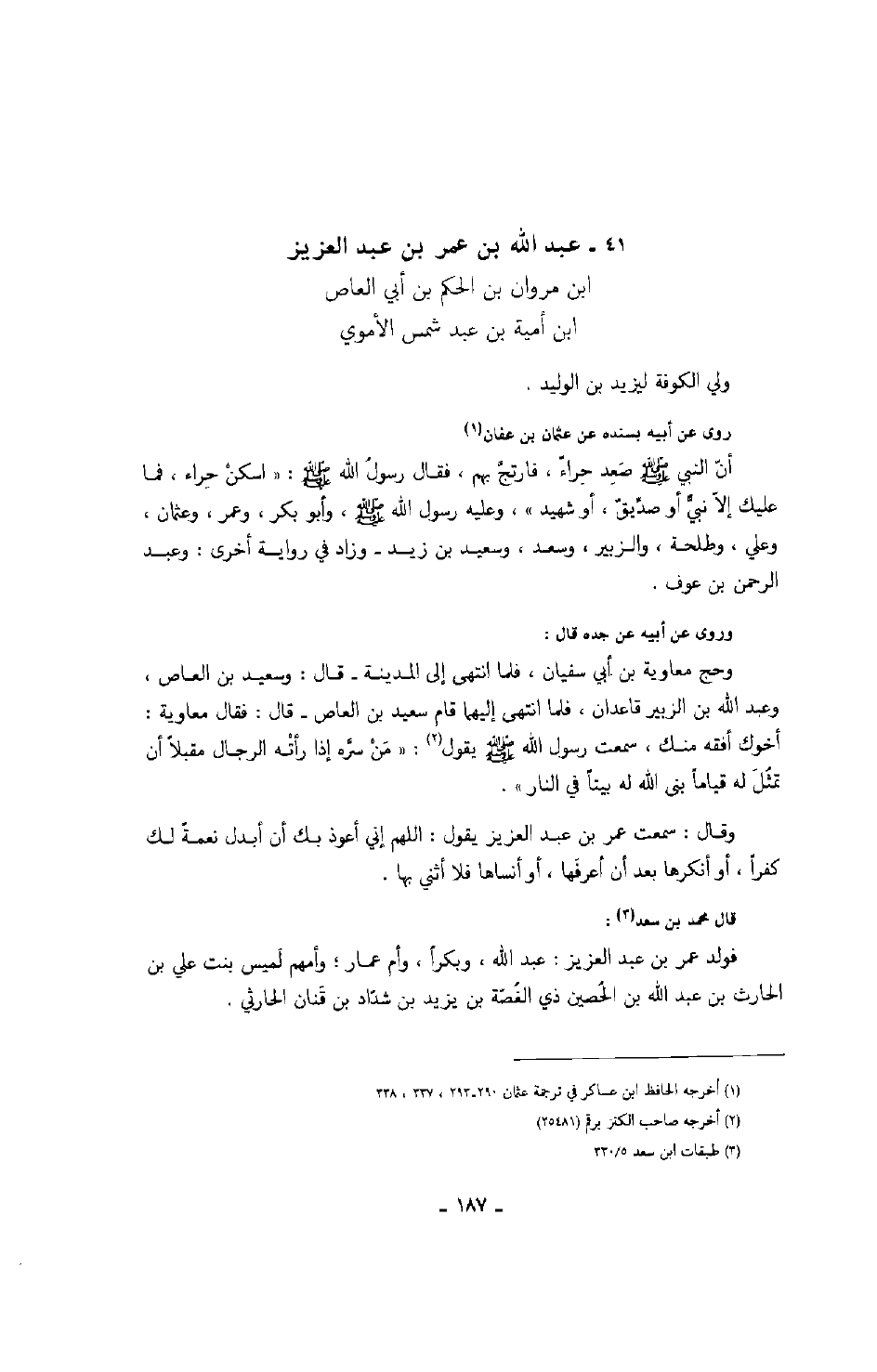 روى عن أبيه بسنده عن عثمان بن عفان: أن النبي صَلَّى اللهُ عَلَيْهِ وَسَلَّمَ صعد حراء، فارتج بهم، فقال رسول الله صَلَّى اللهُ عَلَيْهِ وَسَلَّمَ: " اسكن حراء فما عليك إلا نبي أو صديق، أو شهيد " وعليه رسول الله صَلَّى اللهُ عَلَيْهِ وَسَلَّمَ وأبو بكر، وعمر، وعثمان، وعلي، وطلحة، والزبير، وسعد، وسعيد بن زيد - وزاد في رواية أخرى: وعبد الرحمن بن عوف.
