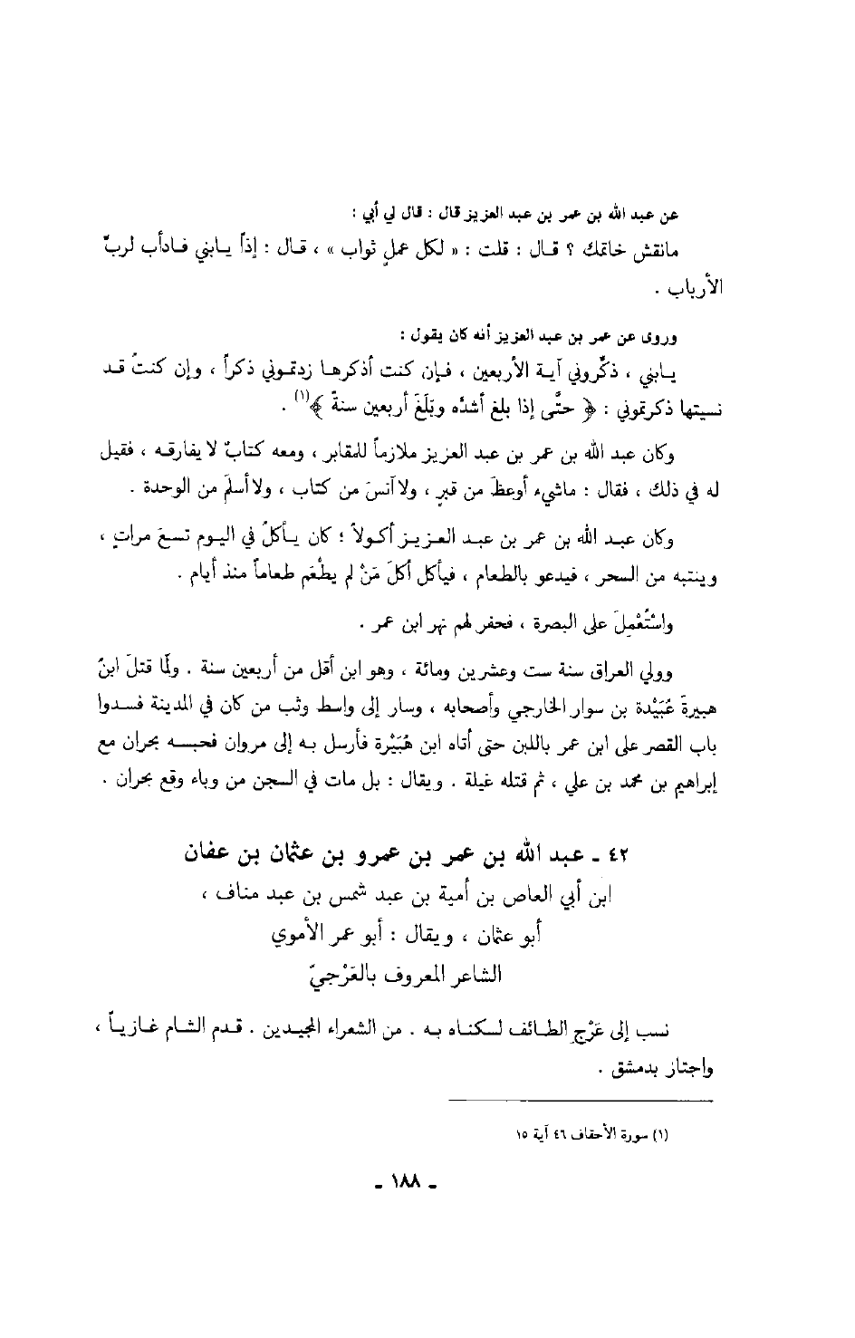وروى عن عمر بن عبد العزيز أنه كان يقول: يا بني، ذكروني آية الأربعين، فإن كنت أذكرها زدتموني ذكراً، وإن كنت قد نسيتها ذكرتموني: " حتى إذا بلغ أشده وبلغ أربعين سنةً ".