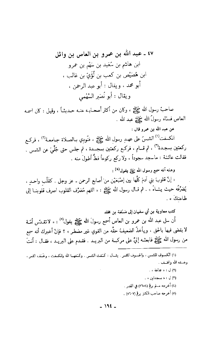 ويقال: أبو عبد الرحمن، ويقال: أبو نصير السهمي صاحب رسول الله صَلَّى اللهُ عَلَيْهِ وَسَلَّمَ، وكان من أكثر أصحابه عنه حديثاً، وقيل: كان اسمه العاص فسماه رسول الله صَلَّى اللهُ عَلَيْهِ وَسَلَّمَ عبد الله.