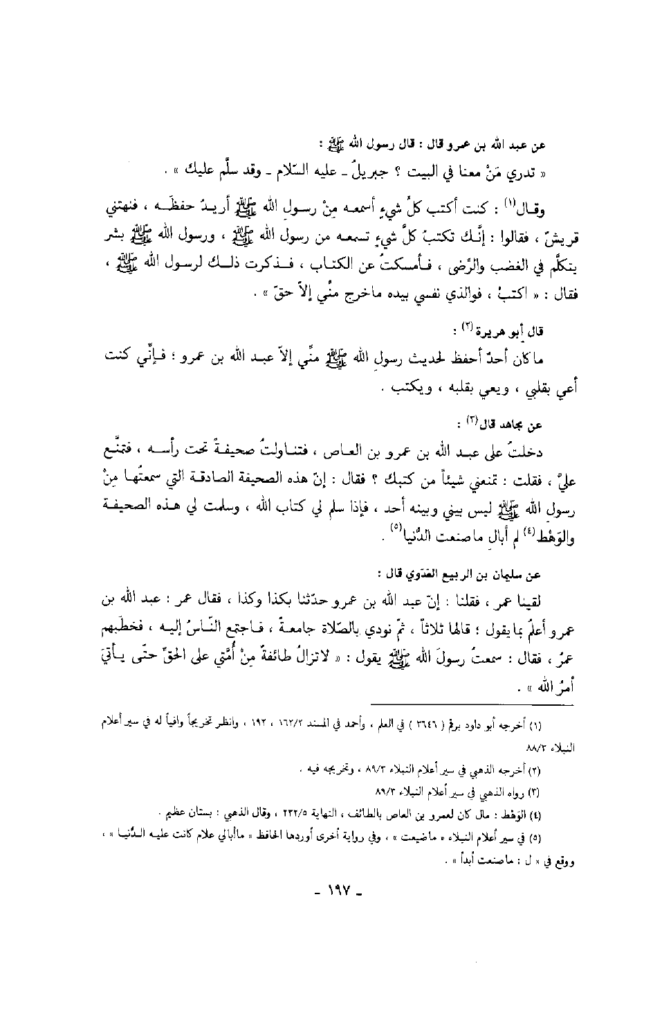 عن مجاهد قال: دخلت على عبد الله بن عمرو بن العاص، فتناولت صحيفة تحت رأسه، فتمنّع عليَّ، فقلت: تمنعني شيئاً من كتبك؟ فقال: إن هذه الصحيفة الصادقة التي سمعتها من رسول الله صَلَّى اللهُ عَلَيْهِ وَسَلَّمَ ليس بيني وبينه أحد، فإذا سلم لي كتاب الله، وسلمت لي هذه الصحيفة والوهط لم أبال ما صنعت الدنيا.