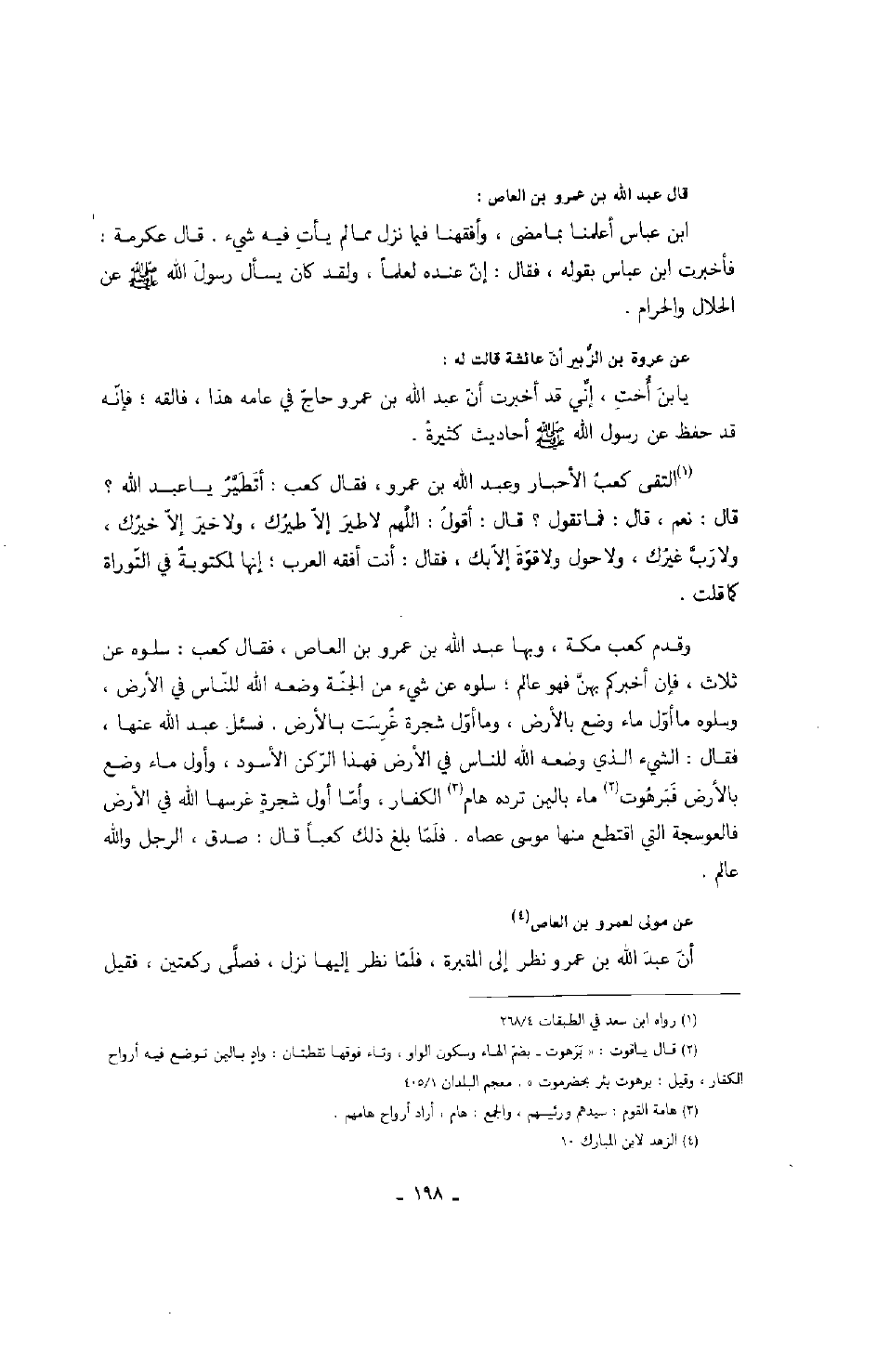 وقدم كعب مكة، وبها عبد الله بن عمرو بن العاص، فقال كعب: سلوه عن ثلاث، فإن أخبركم بهن فهو عالم؛ سلوه عن شيء من الجنة وضعه الله للناس في الأرض، وسلوه ما أول ماء وضع بالأرض، وما أول شجرة غرست بالأرض، فسئل عبد الله عنها، فقال: الشيء الذي وضعه الله للناس في الأرض فهذا الركن الأسود، وأول ماء وضع بالأرض فبرهوت ماء باليمن ترده هام الكفار، وأما أول شجرةٍ غرسها الله في الأرض فالعوسجة التي اقتطع منها موسى عصاه، فلما بلغ ذلك كعباً قال: صدق، الرجل والله عالم.