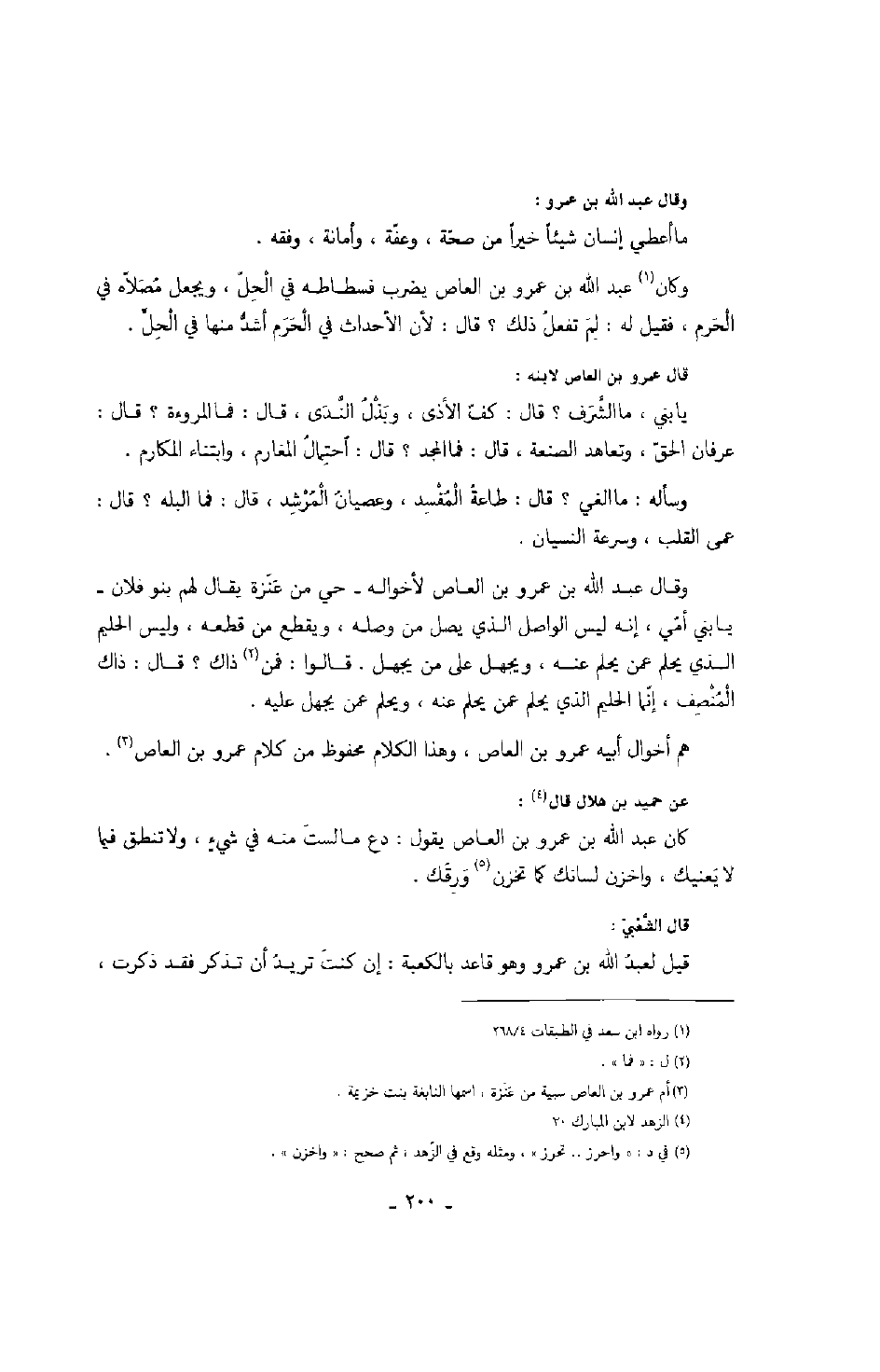 عن حميد بن هلال قال: كان عبد الله بن عمرو بن العاص يقول: دع ما لست منه في شيءٍ، ولا تنطق فيما لا يعنيك، واخزن لسانك كما تخزن ورقك.