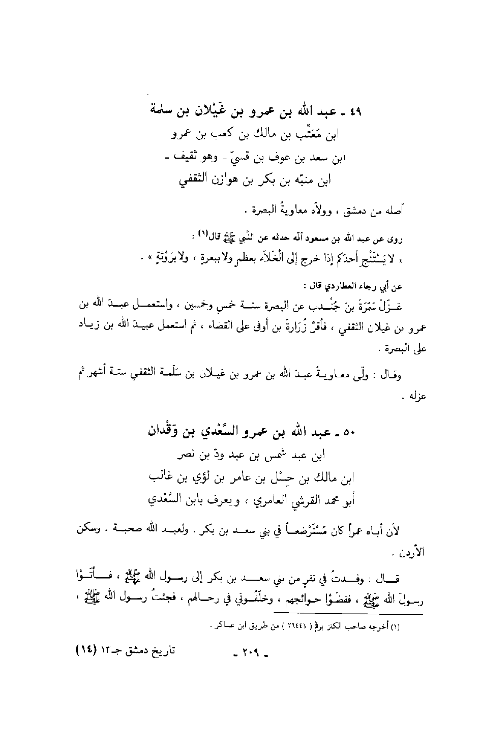 روى عن عبد الله بن مسعود أنه حدثه عن النبي صَلَّى اللهُ عَلَيْهِ وَسَلَّمَ قال: " لا يستنج أحدكم إذا خرج إلى الخلاء بعظمٍ ولا ببعرةٍ، ولا بروثة ".