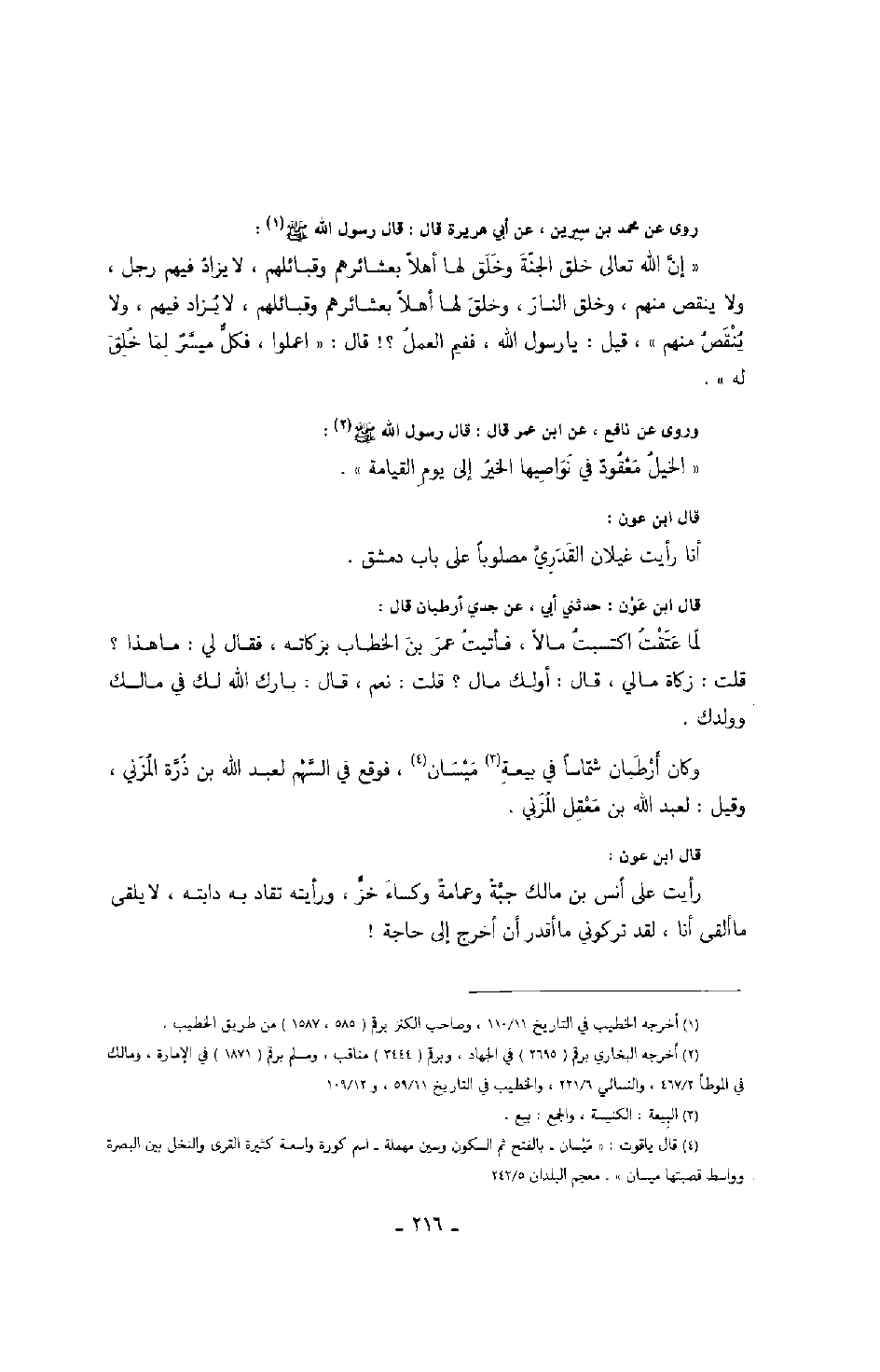 روى عن محمد بن سيرين، عن أبي هريرة قال: قال رسول الله صَلَّى اللهُ عَلَيْهِ وَسَلَّمَ: " إن الله تعالى خلق الجنة وخلق لها أهلاً بعشائرهم وقبائلهم، لا يزاد فيهم رجل، ولا ينقص منهم، وخلق النار، وخلق لها أهلاً بعشائرهم وقبائلهم، لا يزاد فيهم، ولا ينقص منهم " قيل: يا رسول الله، ففيم العمل؟ قال: " اعملوا فكل ميسر لما خلق له ".