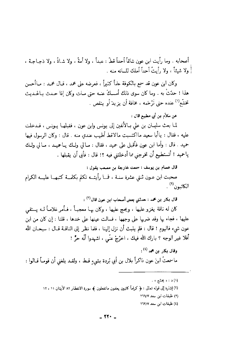 قال عصام بن يوسف: سمعت خارجة بن مصعب يقول: صحبت ابن عون ثنتي عشرة سنة، فما رأيته تكلم بكلمة كتبها عليه الكرام الكاتبون.