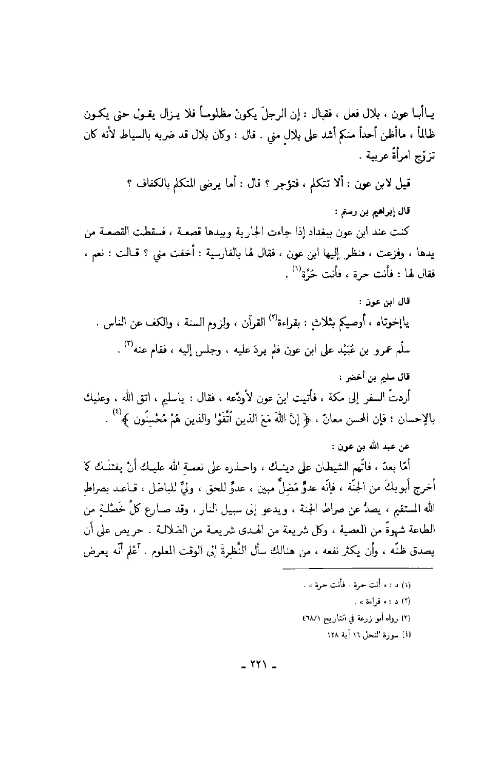 قيل لابن عون: ألا تتكلم، فتؤجر؟ قال: أما يرضى المتكلم بالكفاف؟ قال إبراهيم بن رستم: كنت عند ابن عون ببغداد إذا جاءت الجارية وبيدها قصعة، فسقطت القصعة من يدها، وفزعت، فنظر إليها ابن عون، فقال لها بالفارسية: أخفت مني؟ قالت: نعم، فقال لها: فأنت حرة، فأنت حرة.