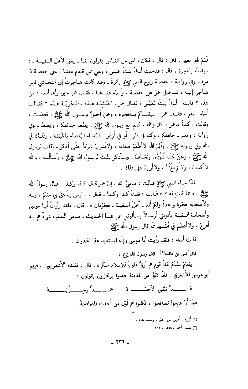 قسم لهم معهم، قال: قال: فكان ناس من الناس يقولون لنا - يعني لأهل السفينة -: سبقناكم بالهجرة، قال: فدخلت أسماء بنت عميس، وهي ممن قدم معنا، على حفصة ذا مرة - وفي رواية: حفصة زوج النبي صَلَّى اللهُ عَلَيْهِ وَسَلَّمَ زائرةً - وقد كانت هاجرت إلى النجاشي فيمن هاجر إليه، فدخل عمر على حفصة، وأسماء عندها، فقال عمر حين رأى أسماء: من هذه؟ قالت: أسماء بنت عميس، فقال عمر: آلحبشيه هذه، آلبحرية هذه؟ فقالت أسماء: نعم، فقال عمر: سبقناكم بالهجرة، ونحن أحق برسول الله صَلَّى اللهُ عَلَيْهِ وَسَلَّمَ، فغضبت، وقالت: كلمةً يا عمر، كلا والله، كنتم مع رسول الله صَلَّى اللهُ عَلَيْهِ وَسَلَّمَ، يطعم جائعكم، ويعظ - وفي رواية: ويعلم - جاهلكم، وكنا في دار - أو في أرض - البعداء والبغضاء بالحبشة، وذلك في الله وفي رسوله صَلَّى اللهُ عَلَيْهِ وَسَلَّمَ، وايم الله لا أطعم طعاماً، ولا أشرب شرباً حتى أذكر ما قلت لرسول الله صَلَّى اللهُ عَلَيْهِ وَسَلَّمَ، ونحن كنا نؤذى ونخاف، وسأذكر ذلك لرسول الله صَلَّى اللهُ عَلَيْهِ وَسَلَّمَ، وأسأله، ووالله لا أكذب، ولا أزيغ، ولا أزيد على ذلك.