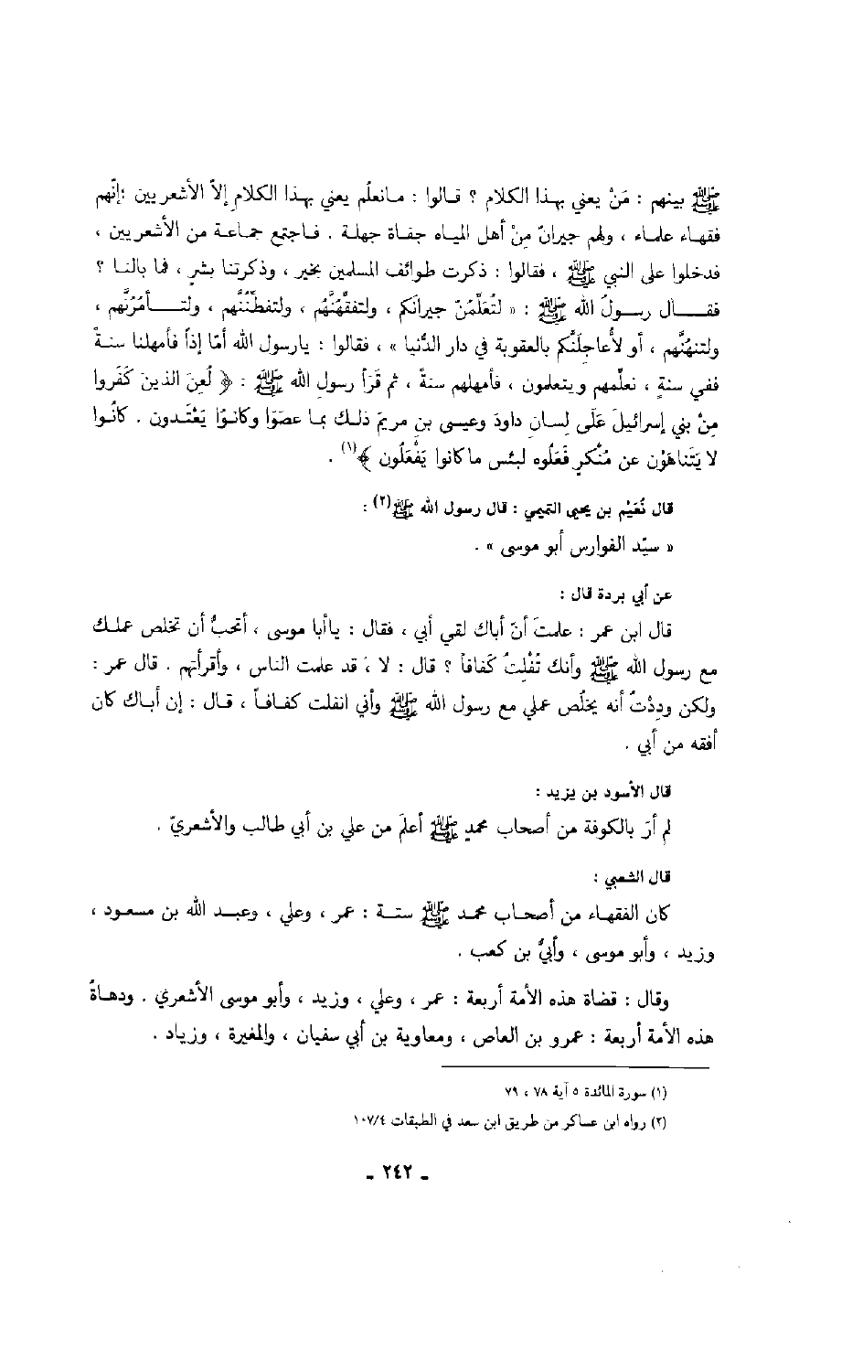 قال الأسود بن يزيد: لم أر بالكوفة من أصحاب محمدٍ صَلَّى اللهُ عَلَيْهِ وَسَلَّمَ أعلم من علي بن أبي طالب والأشعري.